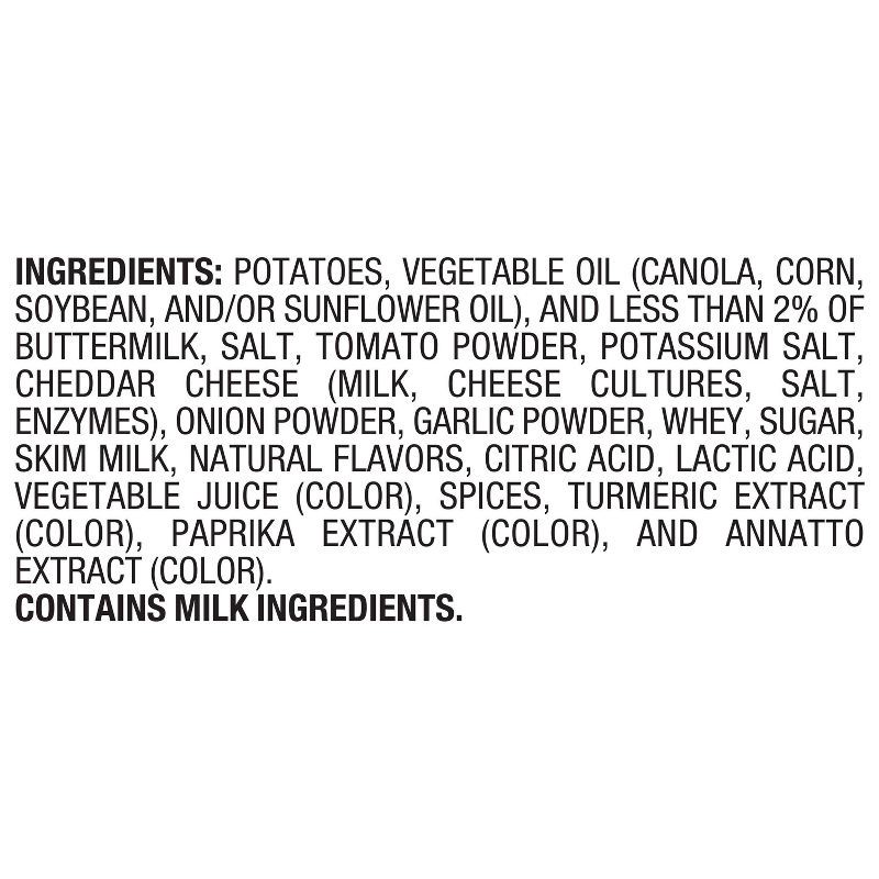 Potatoes, Vegetable Oil (Canola, Corn, Soybean, and/or Sunflower Oil), and Less than 2% of Buttermilk, Salt, Tomato Powder, Potassium Salt, Cheddar Cheese (Milk, Cheese Cultures, Salt, Enzymes), Onion…