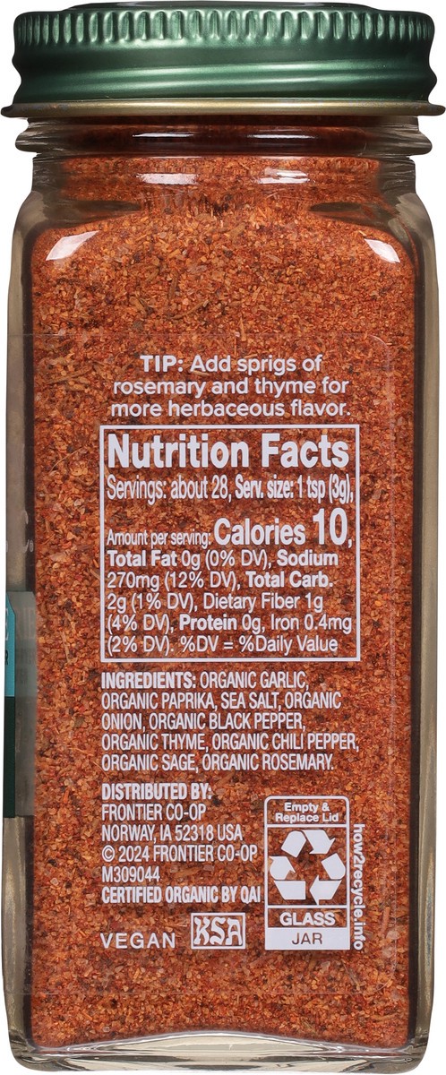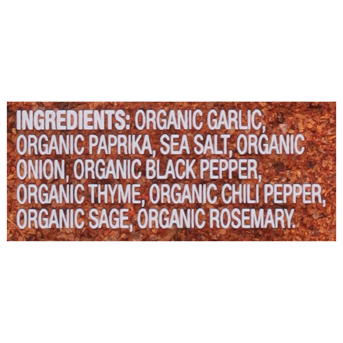 Organic Garlic, Organic Paprika, Sea Salt, Organic Onion, Organic Black Pepper, Organic Thyme, Organic Chili Pepper, Organic Sage, Organic Rosemary.