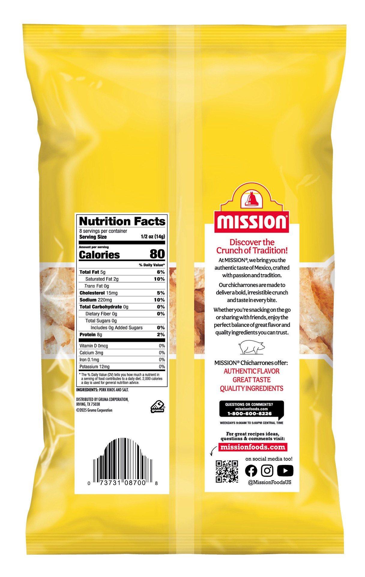 Bring friends and family together with the savory taste and crispy crunch of Mission Original Chicharrones. Our pork rinds are fried to perfection, and then we sprinkle them with salt for a more authe…