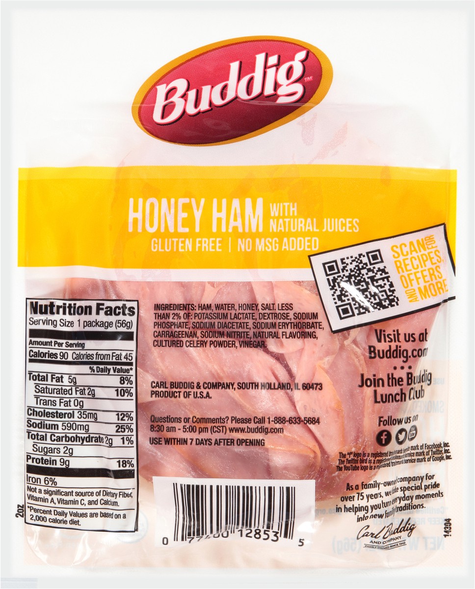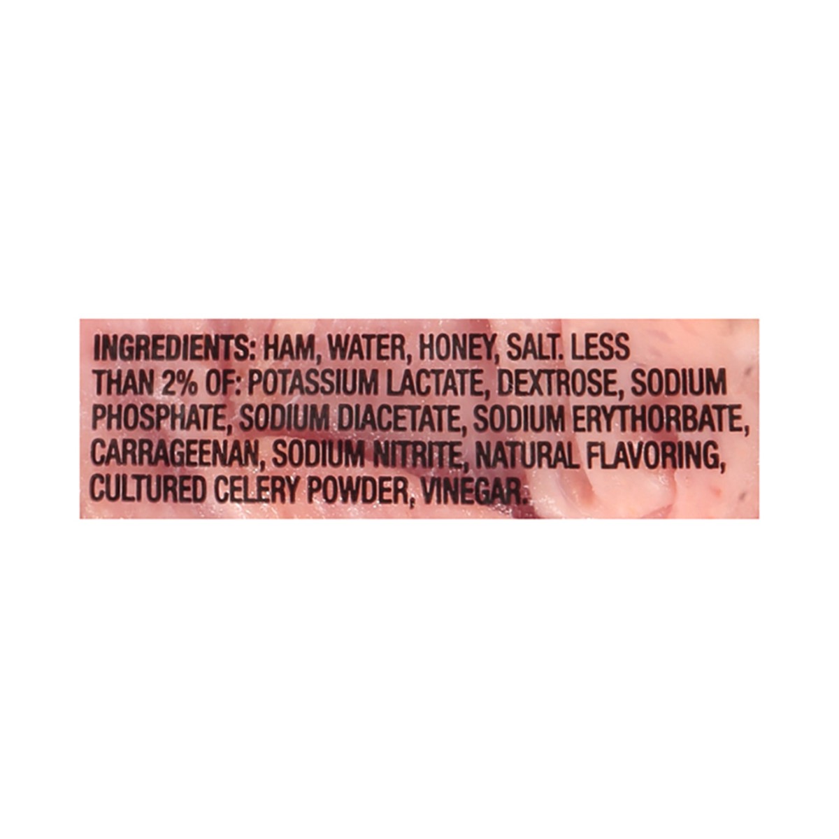 Ham, Water, Honey, Salt, Less than 2% of: Potassium Lactate, Dextrose, Sodium Phosphate, Sodium Diacetate, Sodium Erythorbate, Carrageenan, Sodium Nitrite, Natural Flavoring, Cultured Celery Powder, V…