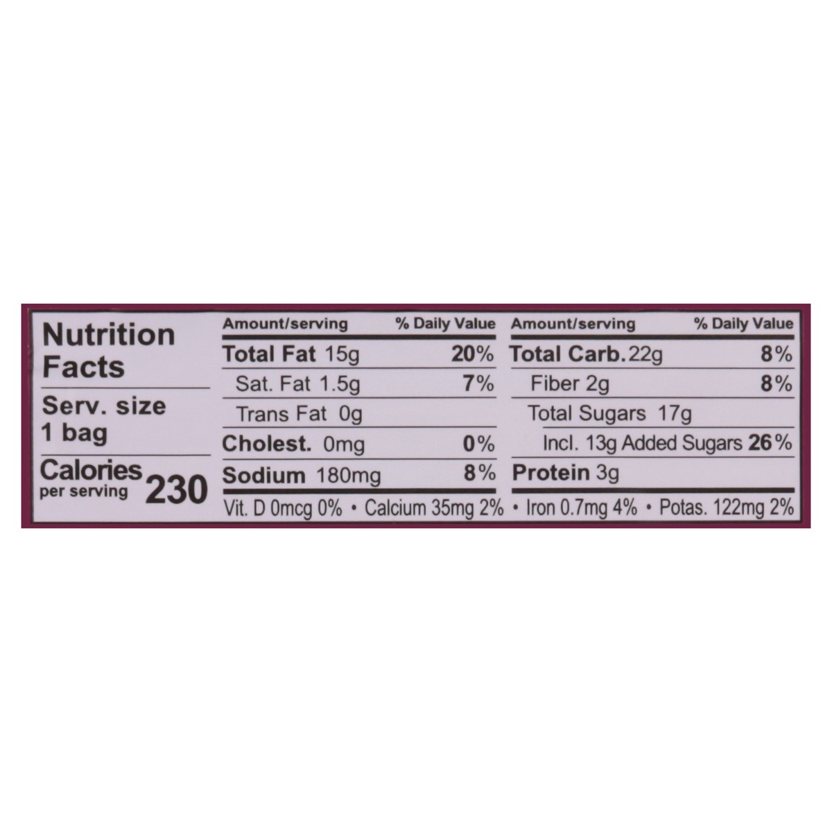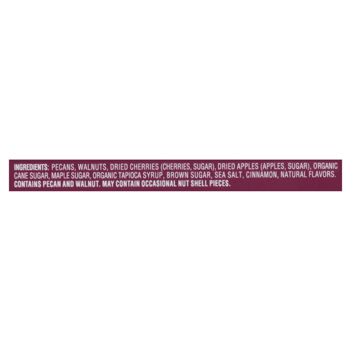 Pecans, Walnuts, Dried Cherries (Cherries, Sugar), Dried Apples (Apples, Sugar), Organic Cane Sugar, Maple Sugar, Organic Tapioca Syrup, Brown Sugar, Sea Salt, Cinnamon, Natural Flavors.