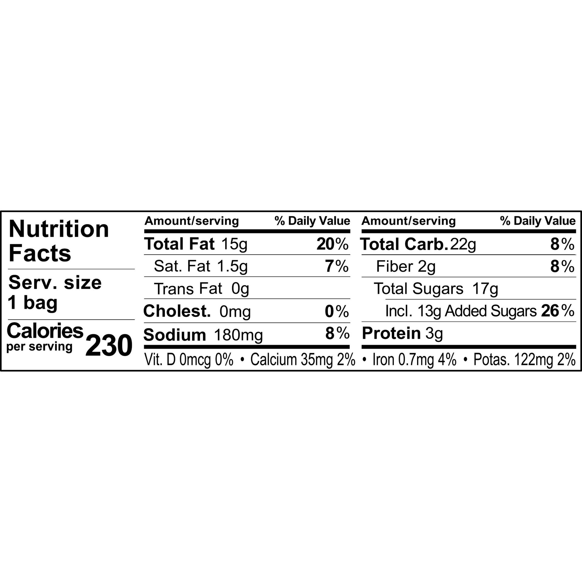 Pecans, Walnuts, Dried Cherries (cherries, Sugar), Dried Apples (apples, Sugar), Organic Cane Sugar, Maple Sugar, Organic Tapioca Syrup, Brown Sugar, Sea Salt, Cinnamon, Natural Flavors.