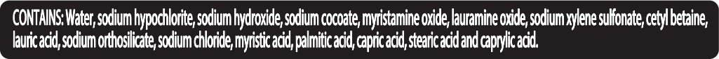 Contains: Water, Sodium Hypochlorite, Sodium Hydroxide, Sodium Cocoate, Myristamine Oxide, Lauramine Oxide, Sodium Xylene Sulfonate, Cetyl Betaine, Lauric Acid, Sodium Orthosilicate, Sodium Chloride, …
