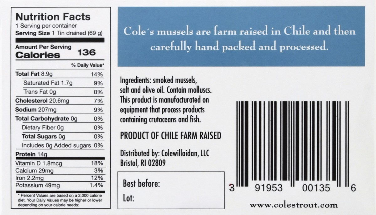 No preservatives. Sustainable selections. Cole's mussels are farm raised in Chile and then carefully hand packed and processed. www.colestrout.com. BPA-free Product of Chile farm raised.