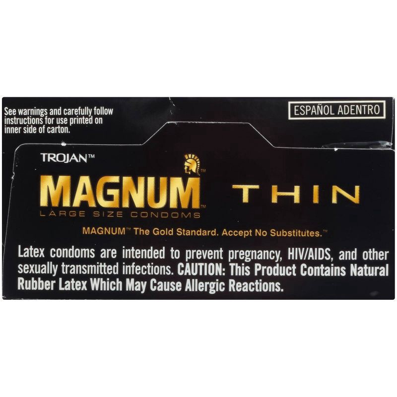 Trojan Magnum Thin Large Size Lubricated Condoms, 12 Count. The Gold Standard in comfort and protection. Accept No Substitutes. They are larger than standard condoms and thinner than regular Magnum co…
