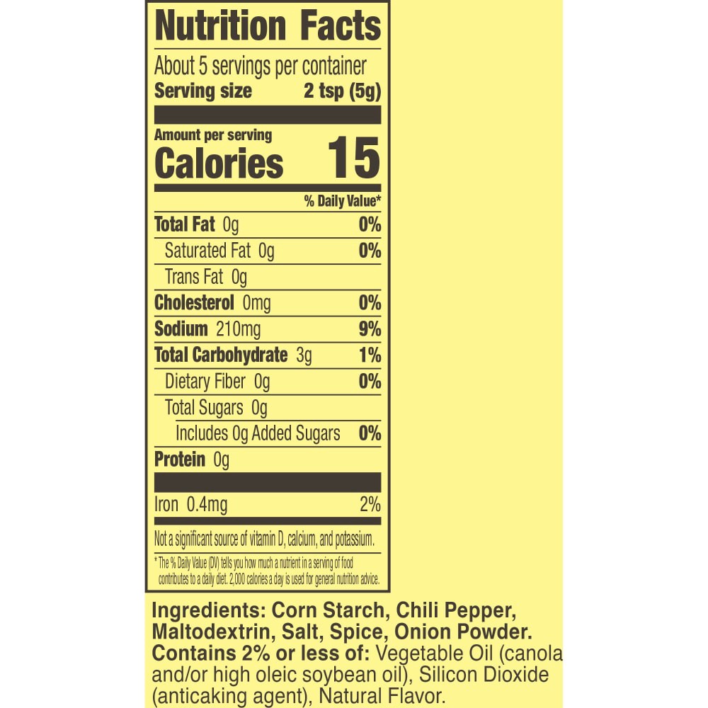 Corn Starch, Chili Pepper, Maltodextrin, Salt, Spice, Onion Powder, Contains 2% or Less of: Vegetable Oil (Canola, High Oleic Soybean and/or Sunflower Oil), Silicon Dioxide (Anticaking Agent), Natural…
