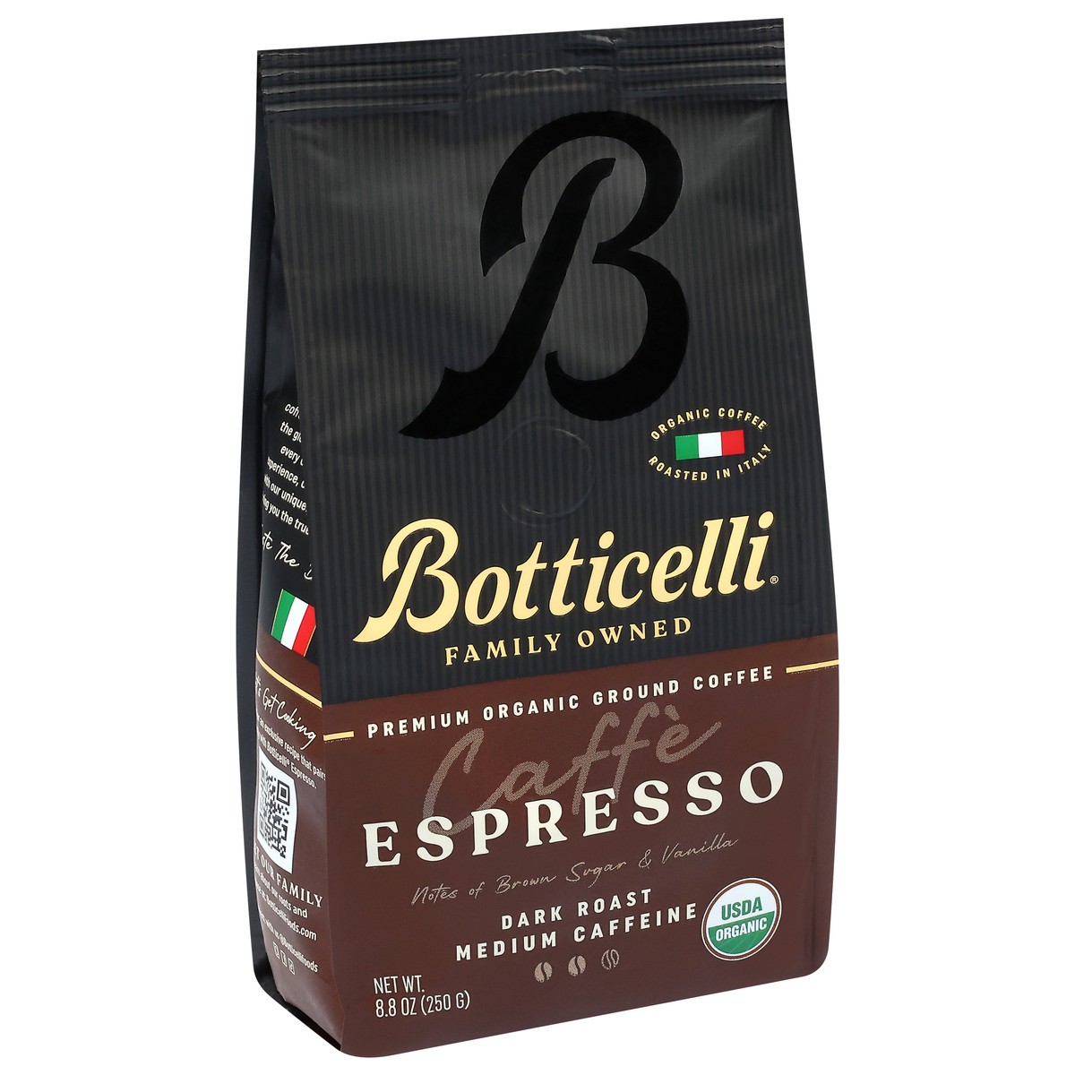 Notes of brown sugar & vanilla. USDA Organic. Certified Organic by CCPB srl. Family owned. Premium organic ground coffee. Espresso the Botticelli way. Experience the essence of Italy. Imagine the sens…
