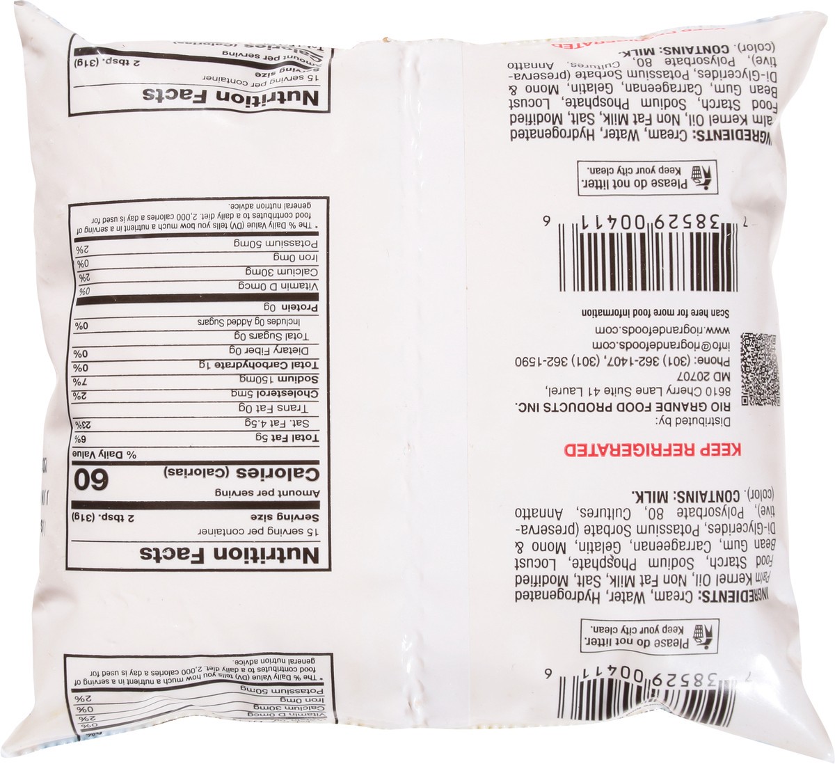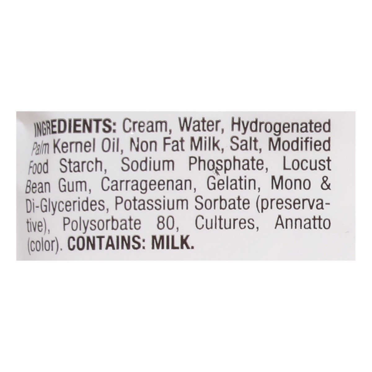 Cream, Water, Hydrogenated Palm Kernel Oil, Non Fat Milk, Salt, Modified Food Starch, Sodium Phosphate, Locust Bean Gum, Carrageenan, Gelatin, Mono & Di-Glycerides, Potassium Sorbate (Preservative), P…