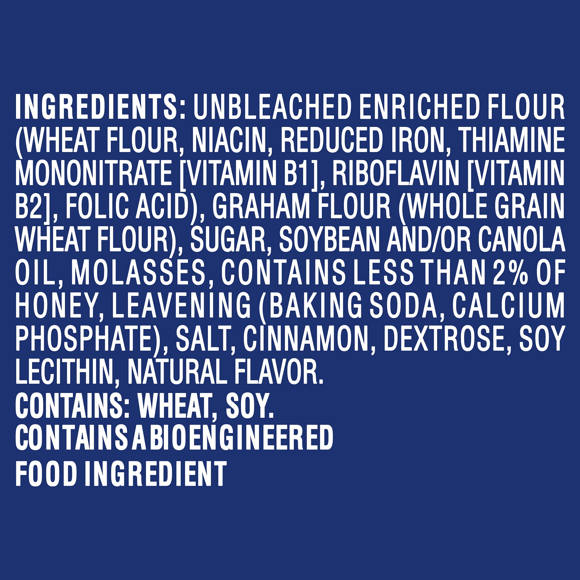 INGREDIENTS: UNBLEACHED ENRICHED FLOUR (WHEAT FLOUR, NIACIN, REDUCED IRON, THIAMINE MONONITRATE [VITAMIN B1], RIBOFLAVIN [VITAMIN B2], FOLIC ACID), GRAHAM FLOUR (WHOLE GRAIN WHEAT FLOUR), SUGAR, SOYBE…