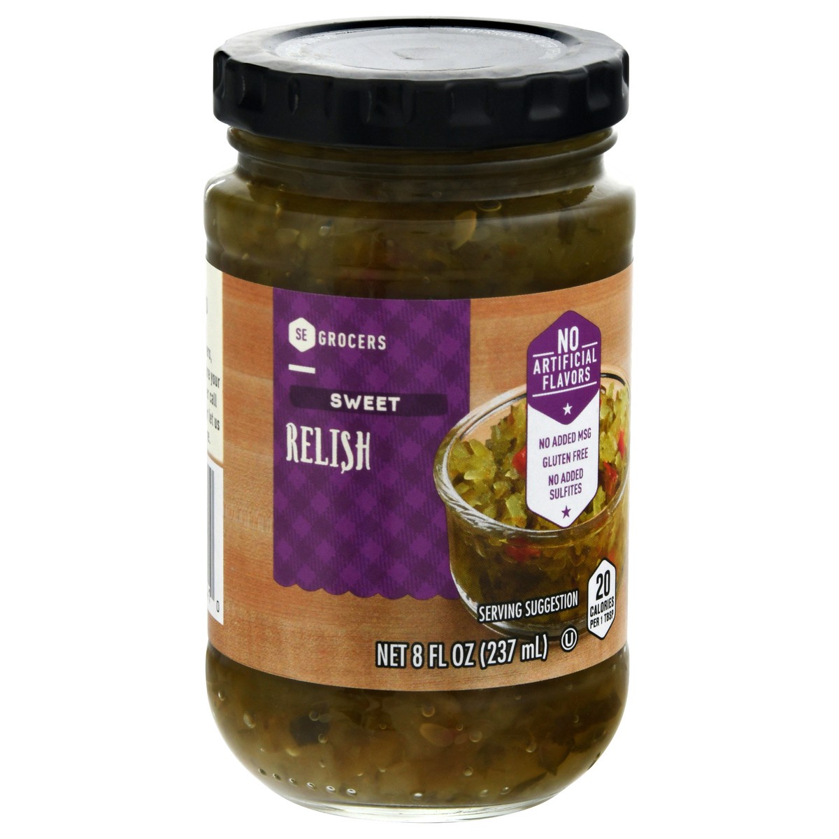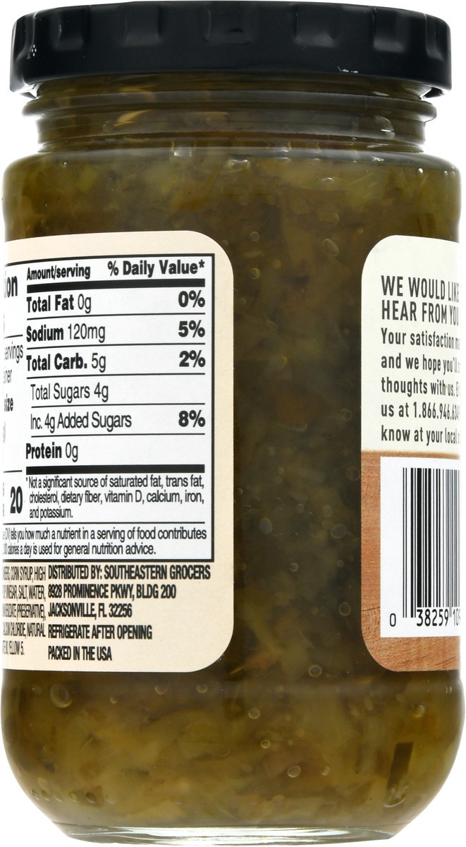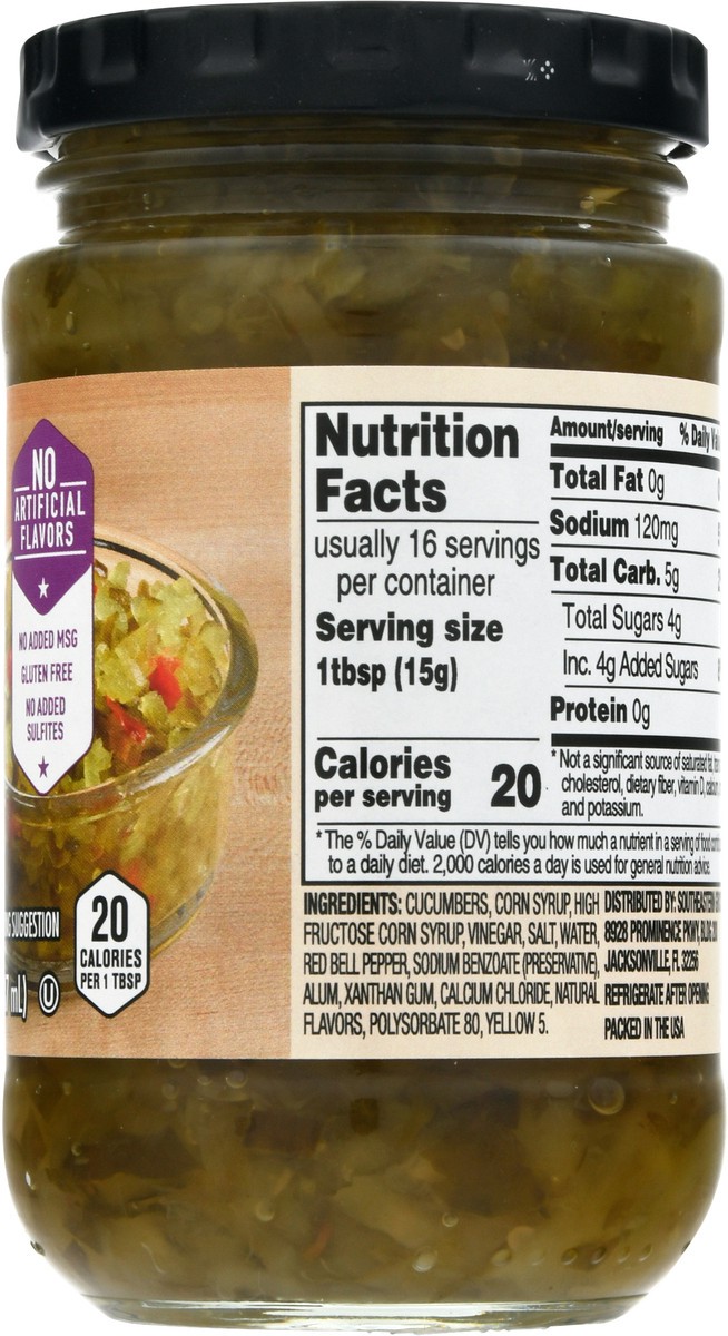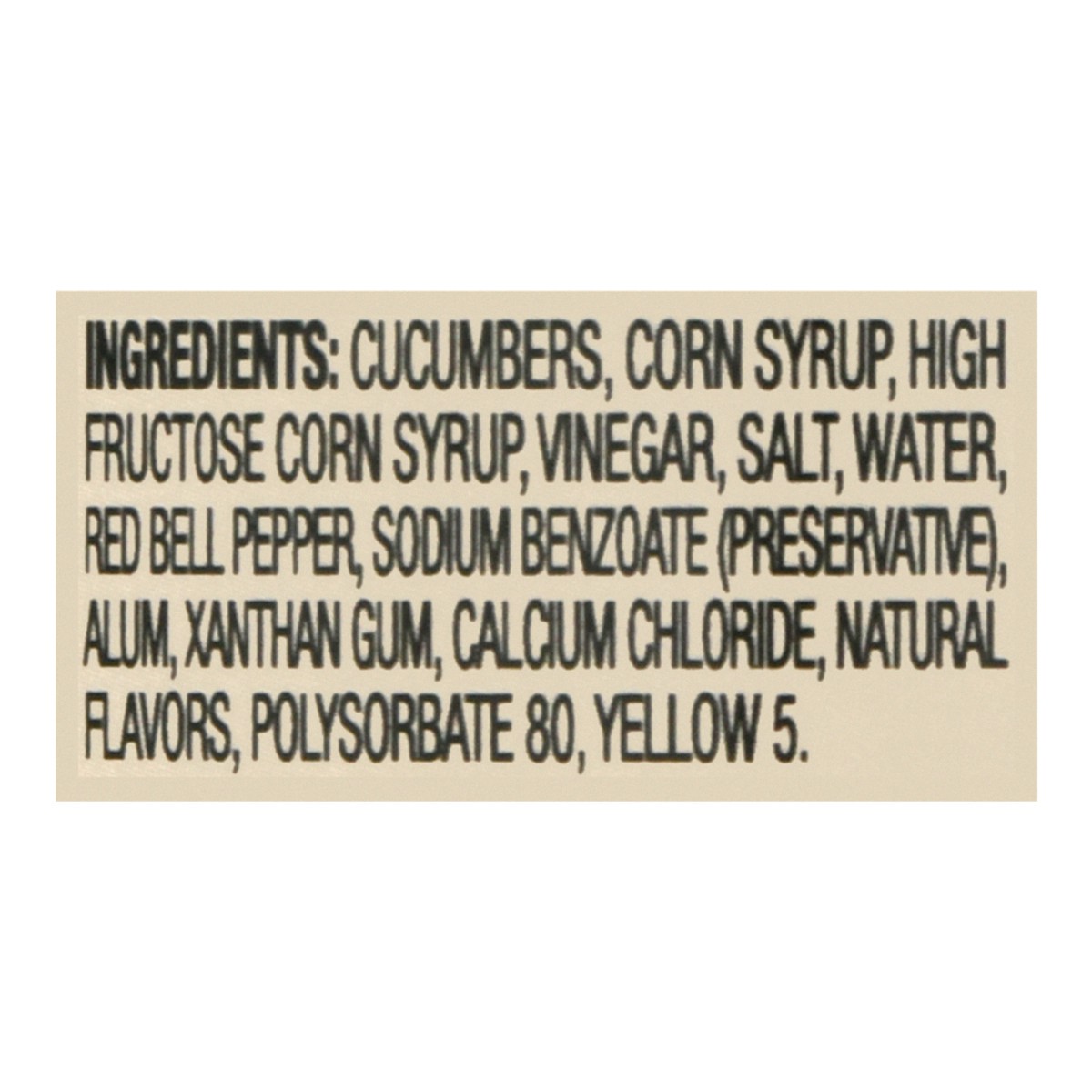 Cucumbers, Corn Syrup, High Fructose Corn Syrup, Vinegar, Salt, Water, Red Bell Pepper, Sodium Benzoate (Preservative), Alum, Xanthan Gum, Calcium Chloride, Natural Flavors, Polysorbate 80, Yellow 5.