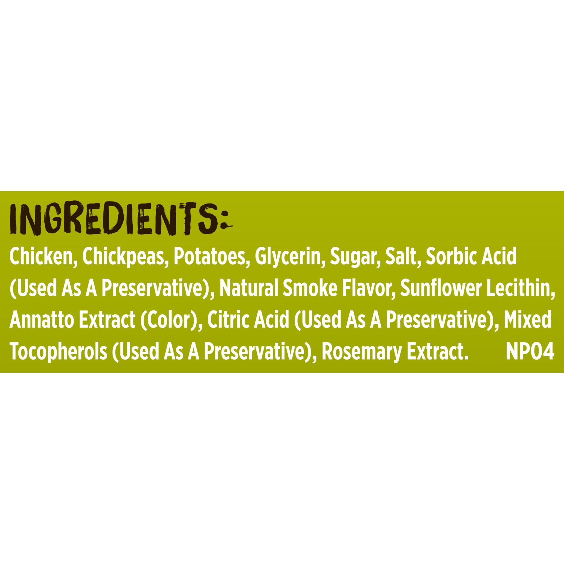 Chicken, Chickpeas, Potatoes, Glycerin, Sugar, Salt, Sorbic Acid (Used as a Preservative), Natural Smoke Flavor, Sunflower Lecithin, Annatto Extract (Color), Citric Acid (Used as a Preservative), Mixe…