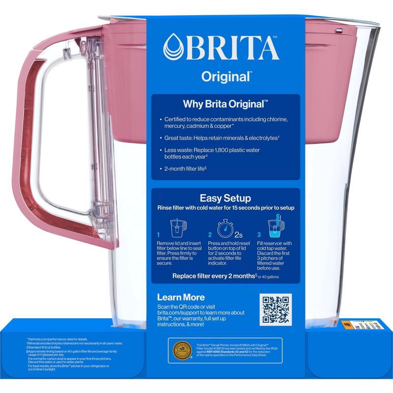 Drink cleaner*, great tasting tap water with this Brita 6-cup Denali water pitcher, made without BPA, and the included Brita Standard filter. Brita Standard filters improve the taste and odor of chlor…