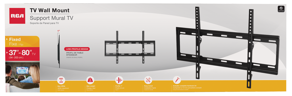 The RCA Flat Universal TV Wall Mount is an easytoassemble, ultraslim design that fits screen sizes 37 to 80 and holds up to 88 lbs. Mounting your TV is easy with lateral shift brackets to enable fast …