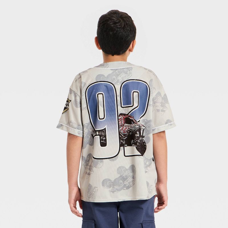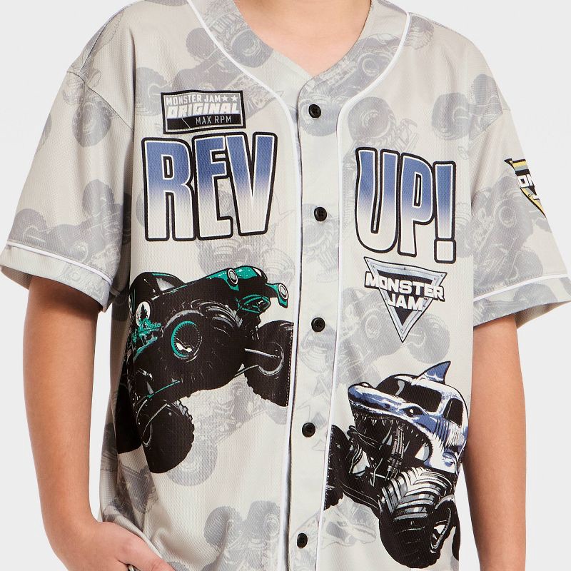 Your kid will love showing off their favorite trucks with this Boys' Monster Jam Baseball Jersey - Gray. Made from soft, breathable fabric, it's comfy enough for everyday adventures. The button-down f…