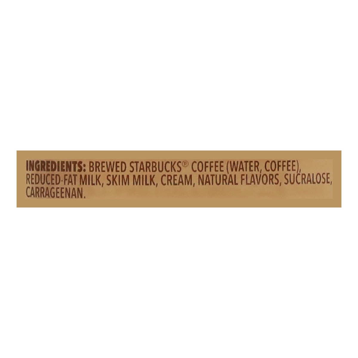 Brewed Starbucks Coffee (Water, Coffee), Reduced-Fat Milk, Skim Milk, Cream, Natural Flavors, Sucralose, Carrageenan.