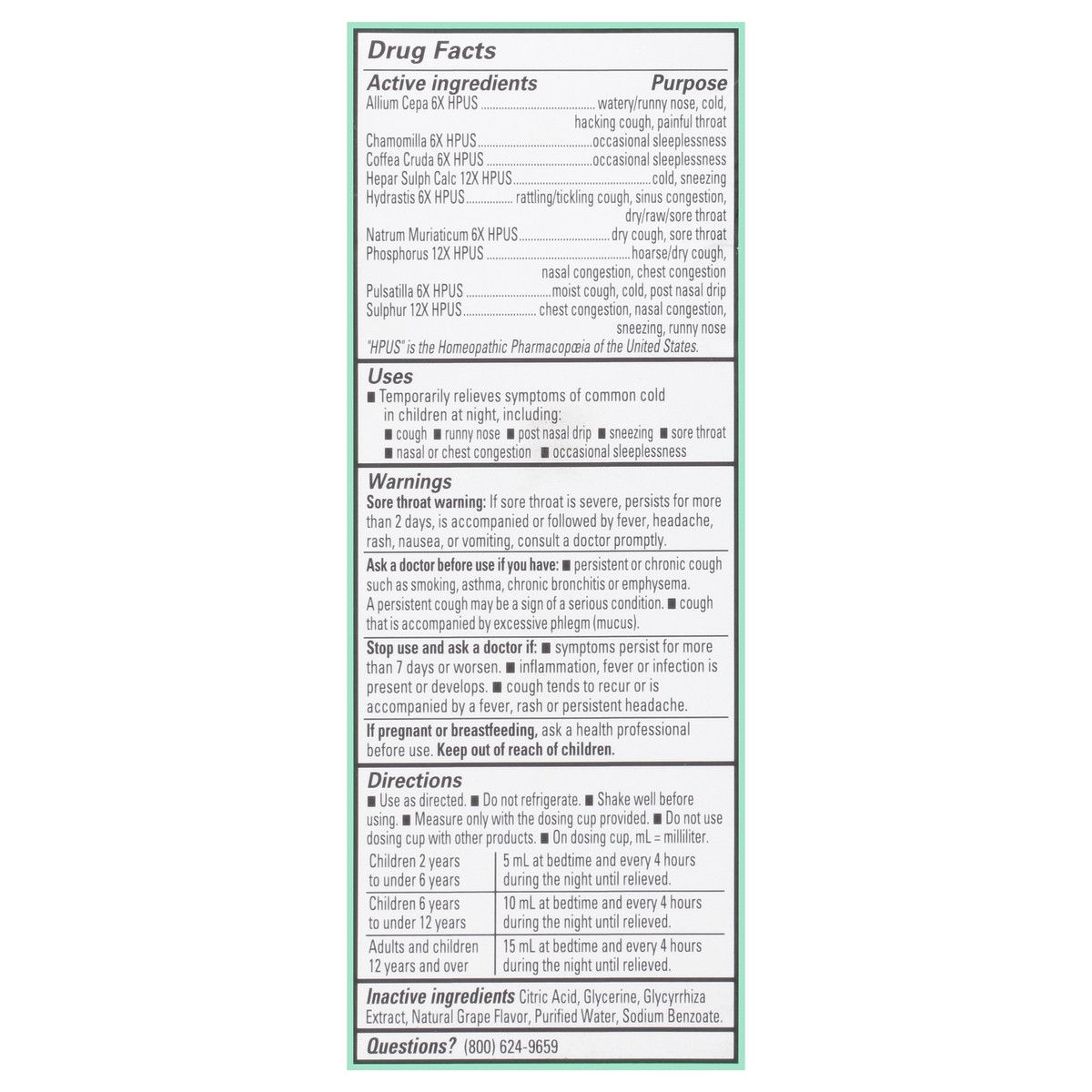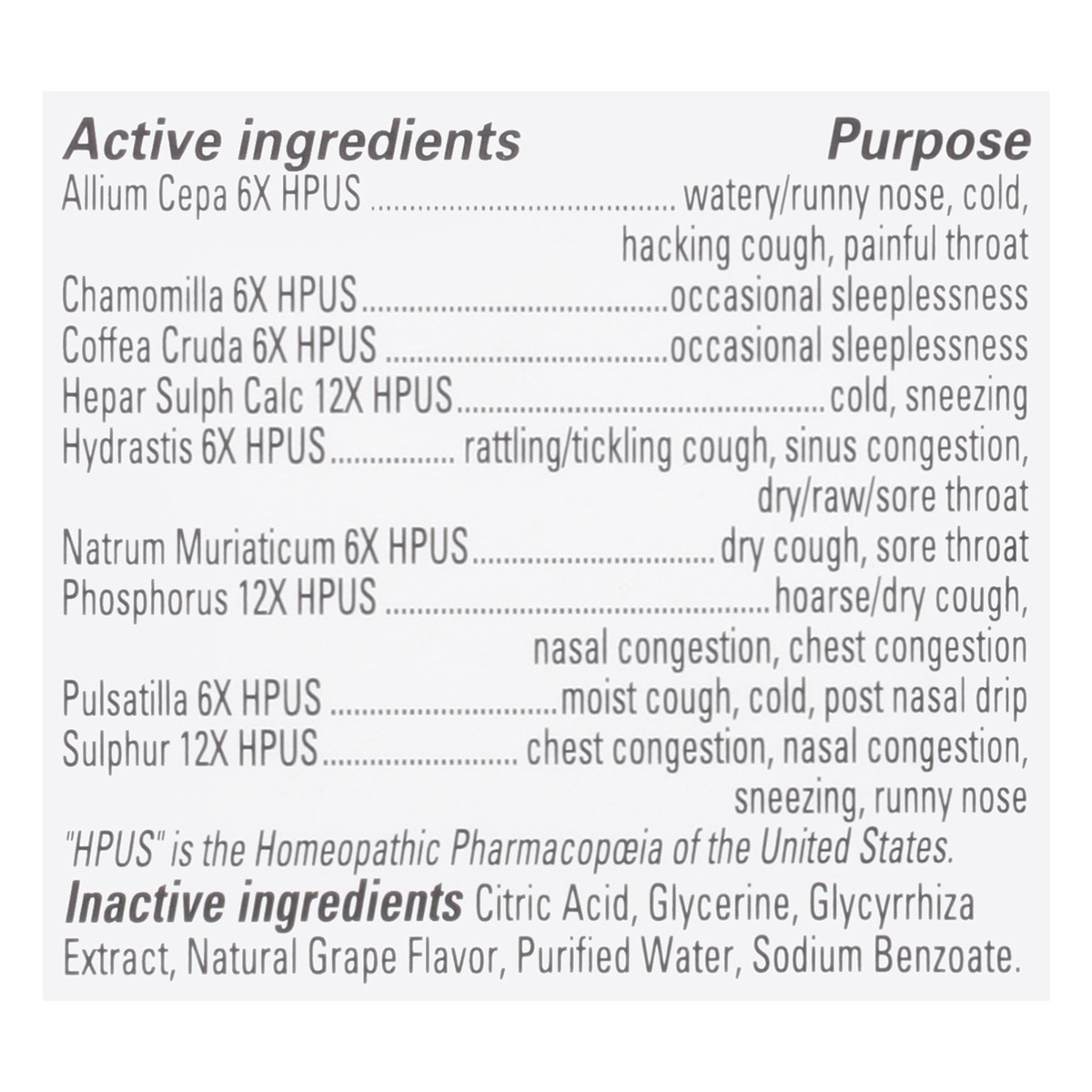 Active Ingredients: Allium Cepa 6X HPUS, Watery/Runny Nose, Cold, Hacking Cough, Painful Throat; Chamomilla 6X HPUS, Occasional Sleepnessness; Coffee Cruda 6X HPUS, Occasional Sleepnessness; Hepar Sul…