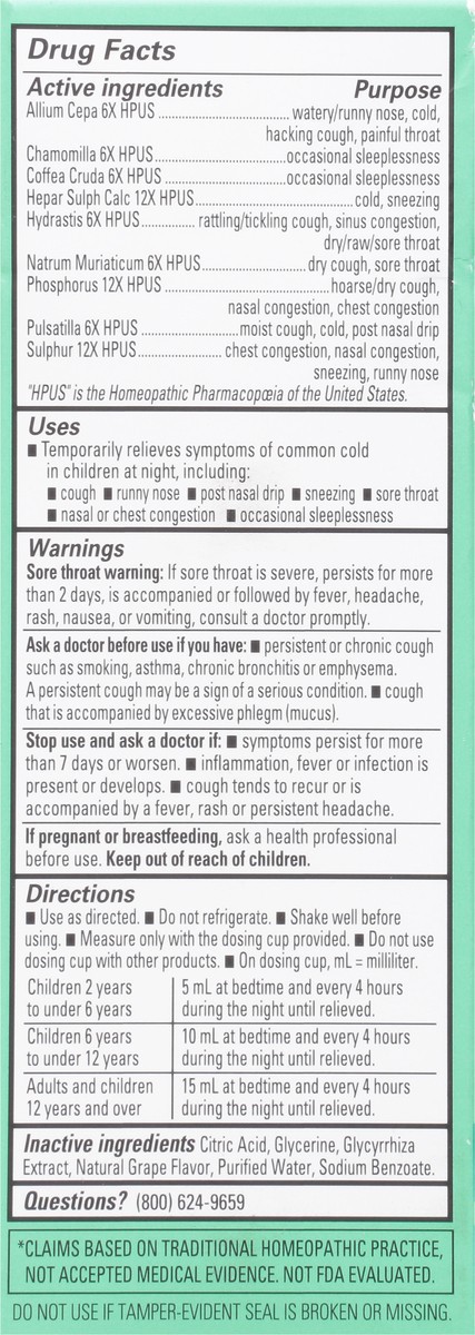 Active Ingredients: Allium Cepa 6X HPUS, Watery/Runny Nose, Cold, Hacking Cough, Painful Throat; Chamomilla 6X HPUS, Occasional Sleepnessness; Coffee Cruda 6X HPUS, Occasional Sleepnessness; Hepar Sul…