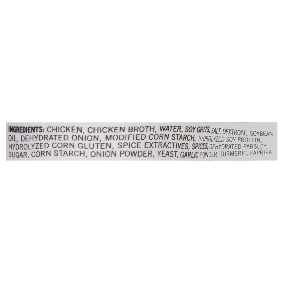 Chicken, Chicken Broth, Water, Soy Grits, Salt, Dextrose, Soybean, Oil, Dehydrated Onion, Modified Corn Starch, Hydrolyzed Soy Protein, Hydrolyzed Corn Gluten, Spice Extractives, Spices, Dehydrated Pa…