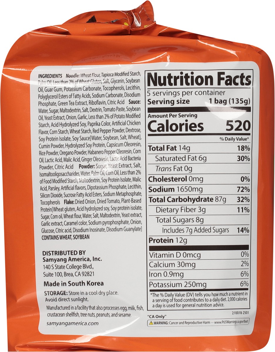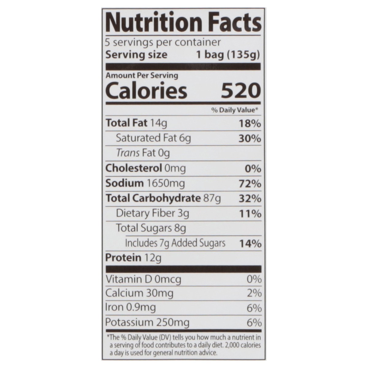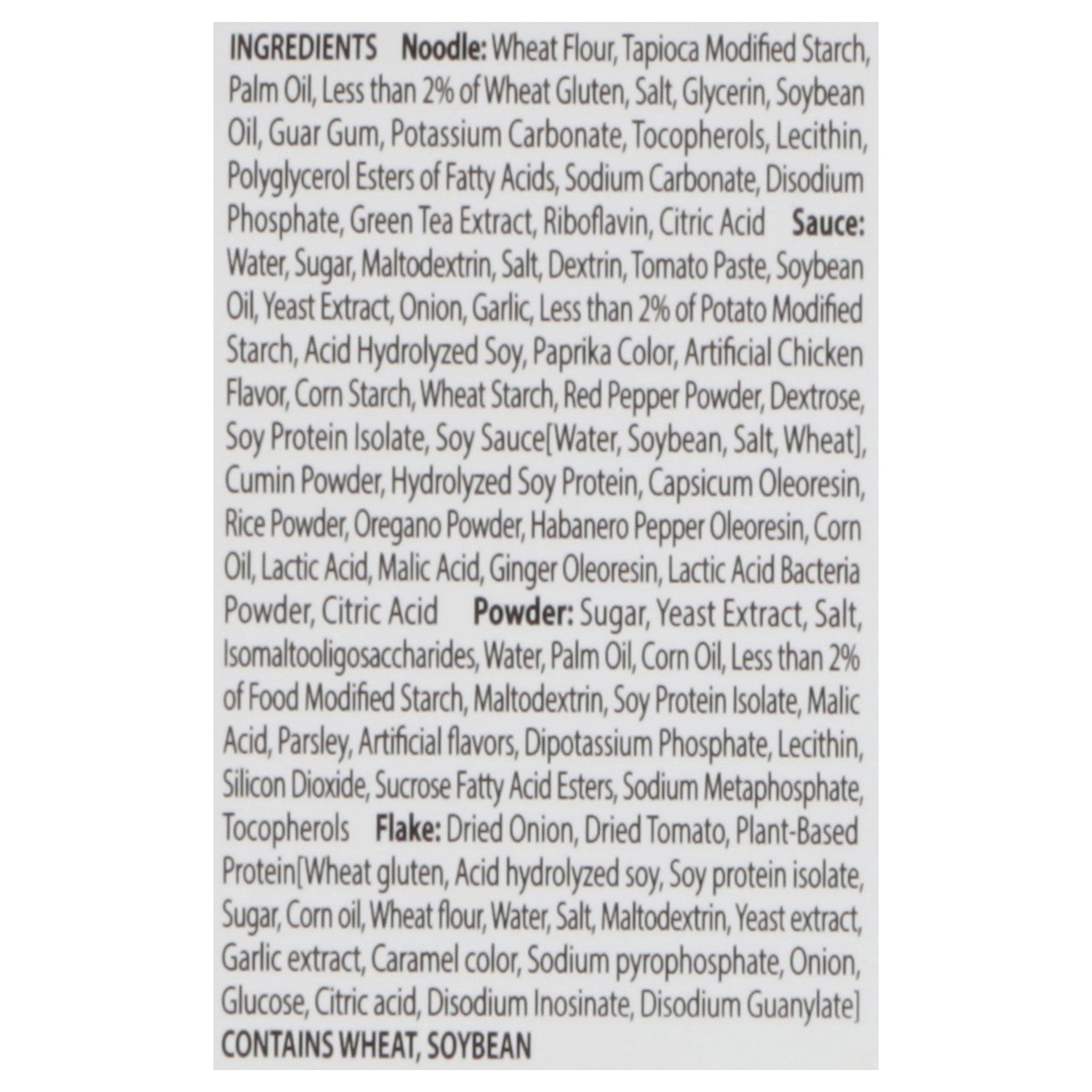 Noodle: Wheat Flour, Tapioca Modified Starch, Palm Oil, Less than 2% of Wheat Gluten, Salt, Glycerin, Soybean Oil, Guar Gum, Potassium Carbonate, Tocopherols, Lecithin, Polyglycerol Esters of Fatty Ac…