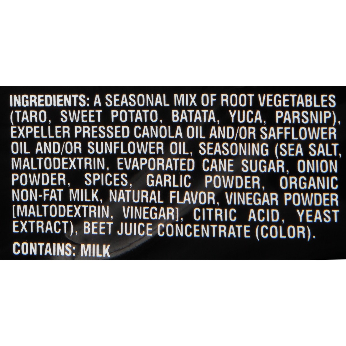 A Seasonal Mix of Root Vegetables (Taro, Sweet Potato, Batata, Yuca, Parsnip), Expeller Pressed Canola Oil and/or Safflower Oil and/or Sunflower Oil, Seasoning (Sea Salt, Maltodextrin, Evaporated Cane…