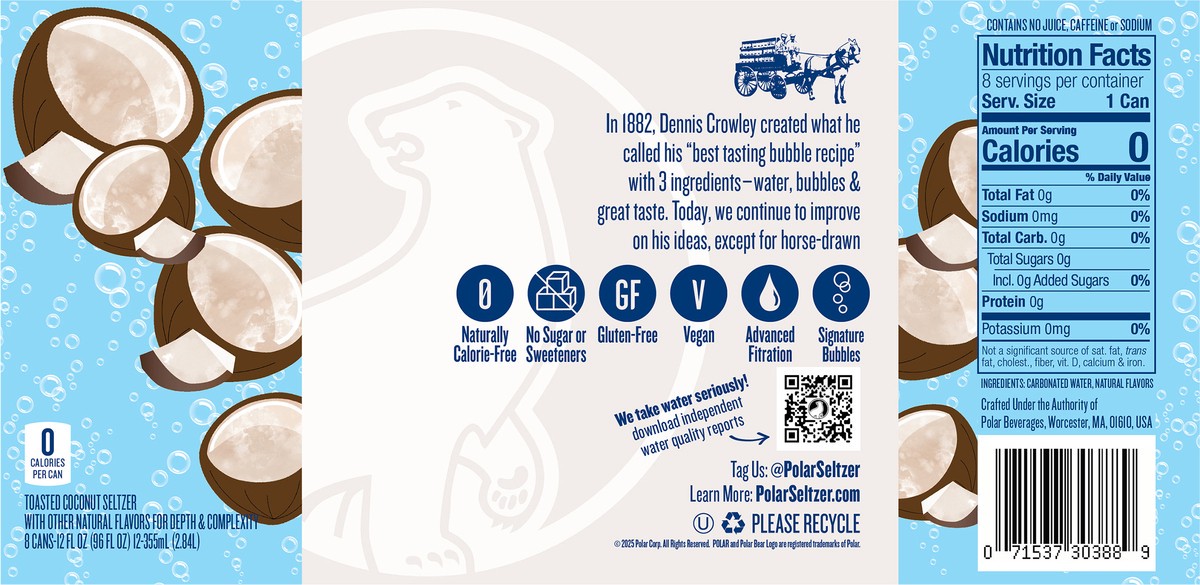 Toasted coconut seltzer with other natural flavors. 0 calories per can. No sodium. Gluten-free. Vegan. We continue to craft seltzer without sugar, sweeteners, sodium or caffeine, and they are always v…
