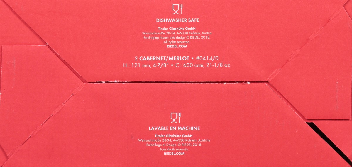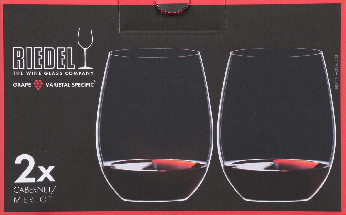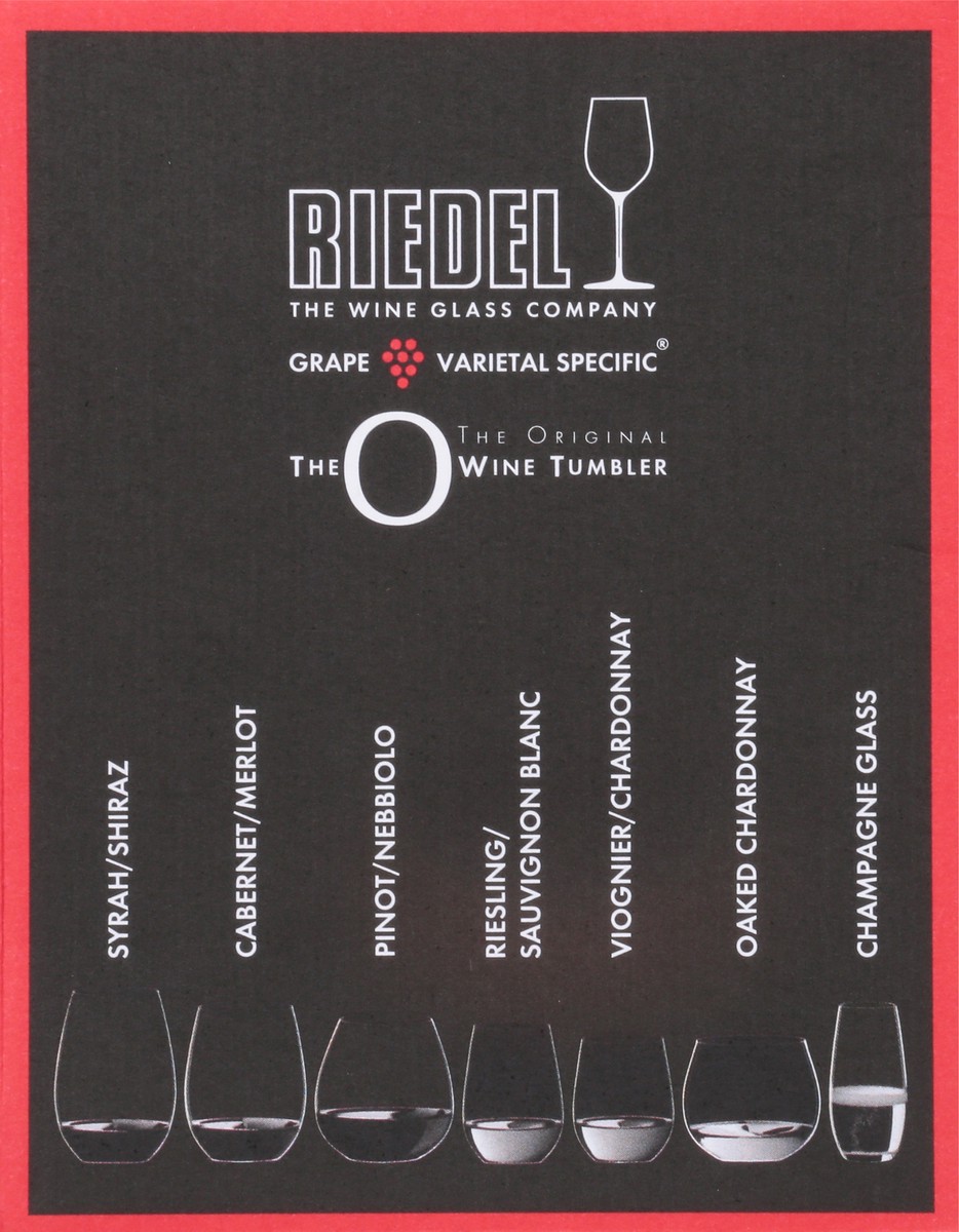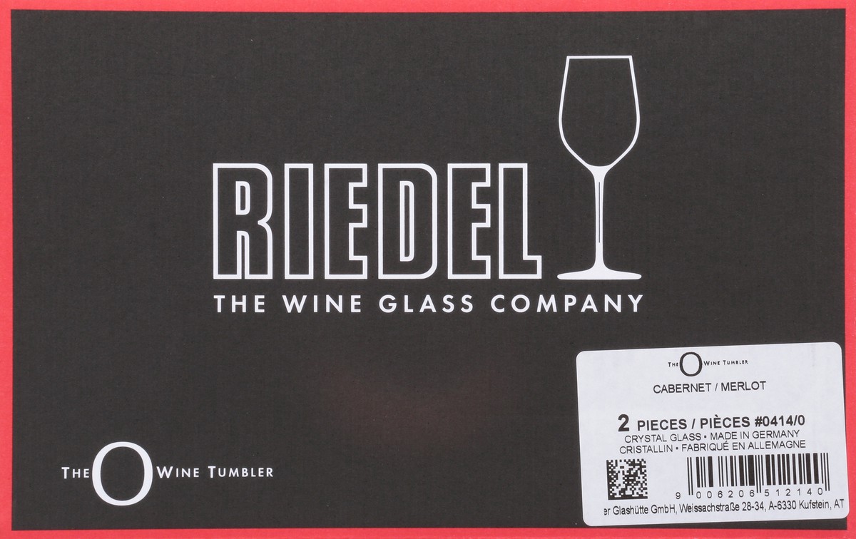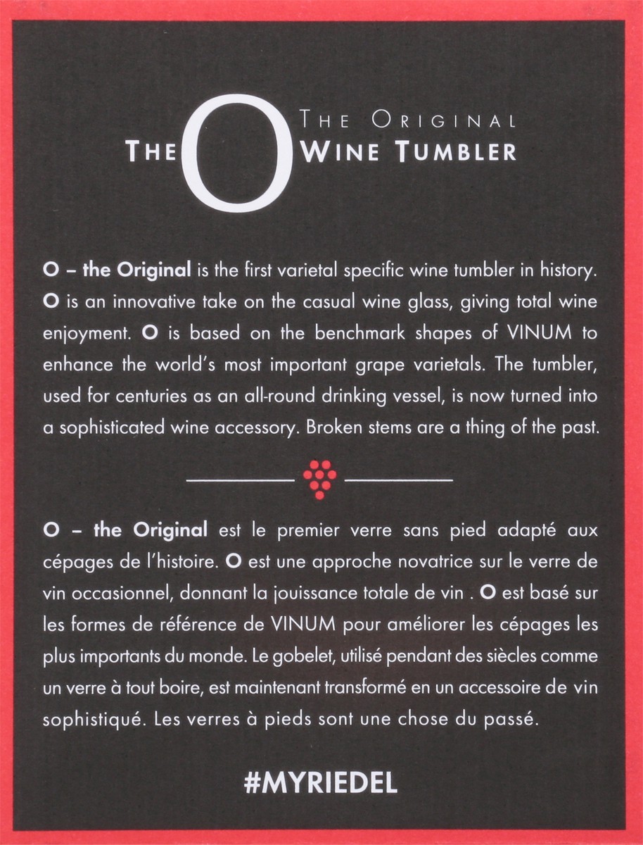 2 pieces. Crystal glass. The original The O wine tumbler. Syrah/Shiraz; cabernet/merlot; pinot/nebbiolo; riesling/sauvignon blanc; viognier/chardonnay; oaked chardonnay; champagne glass. O - the Origiā¦