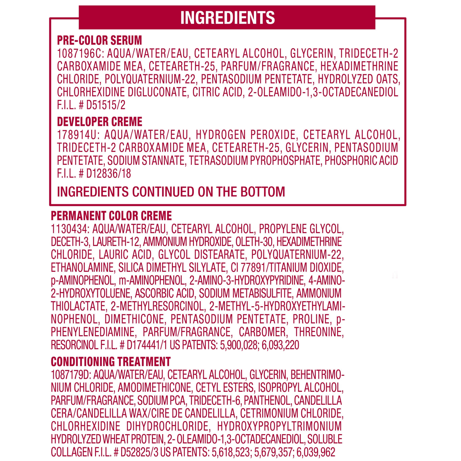 Pre-Color Serum: 1087196C: Aqua/Water, Cetearyl Alcohol, Glycerin, Trideceth-2 Carboxamide MEA, Ceteareth-25, Fragrance, Hexadimethrine Chloride, Polyquaternium-22, Pentasodium Pentetate, Hydrolyzed O…
