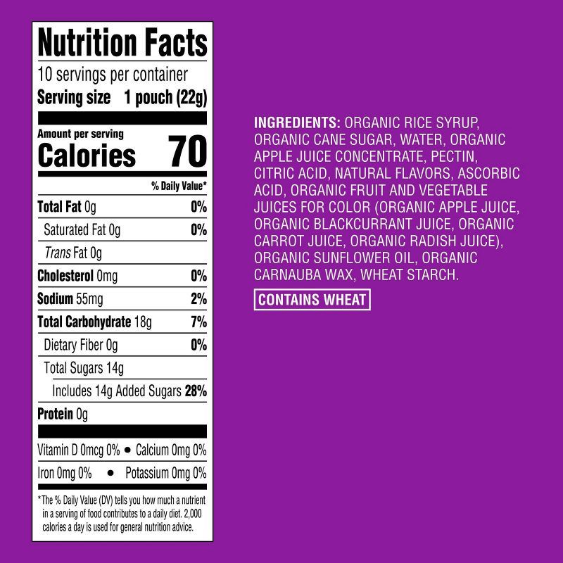 ORGANIC RICE SYRUP, ORGANIC CANE SUGAR, WATER, ORGANIC APPLE JUICE CONCENTRATE, PECTIN, CITRIC ACID, NATURAL FLAVORS, ASCORBIC ACID, ORGANIC FRUIT AND VEGETABLE JUICES FOR COLOR (ORGANIC APPLE JUICE, …