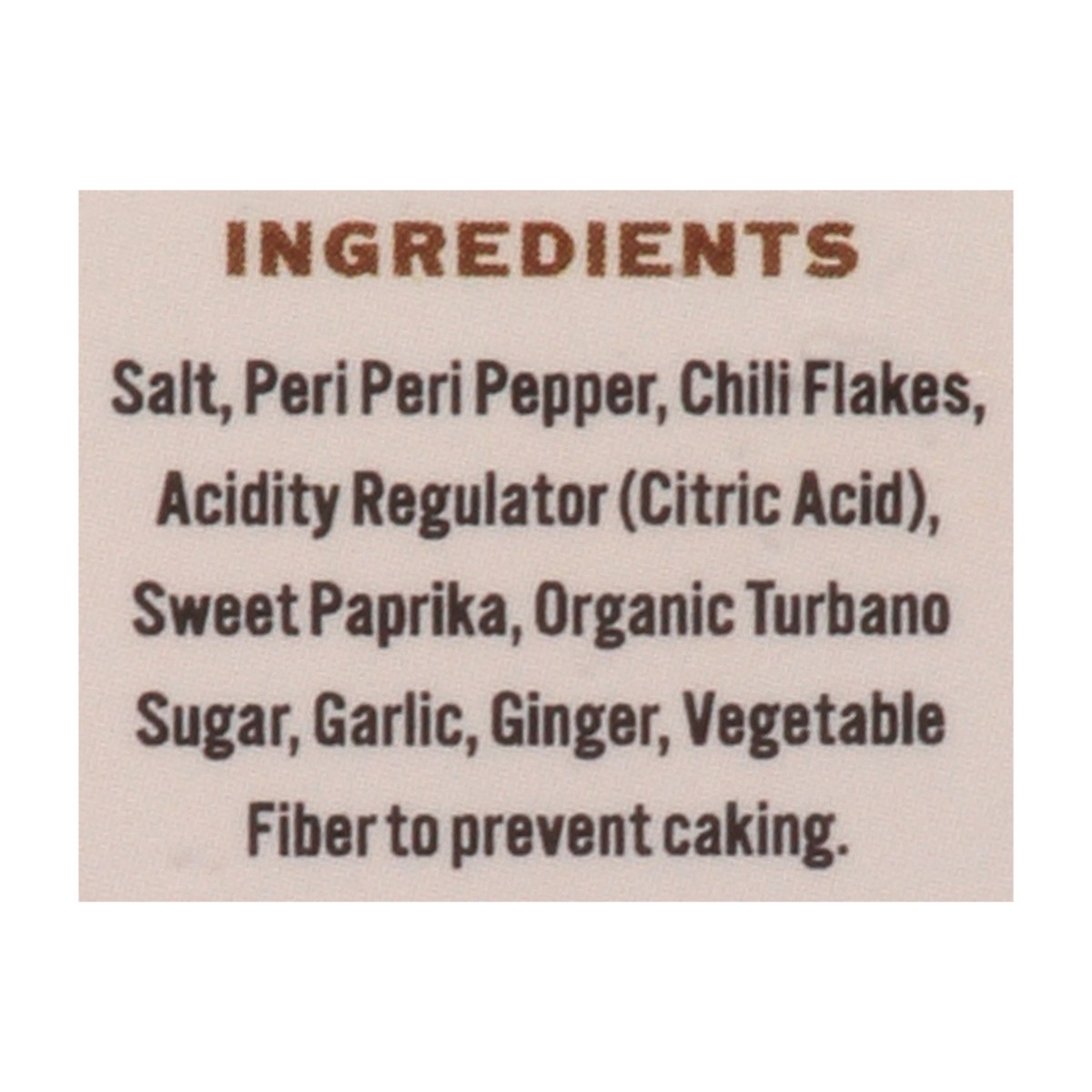 Ingredients Salt, Peri-Peri Pepper, Chili Flakes, Acidity Regulator (Citric Acid), Sweet Paprika, Organic Turbano Sugar, Garlic, Ginger, Vegetable Fiber to Prevent Caking.