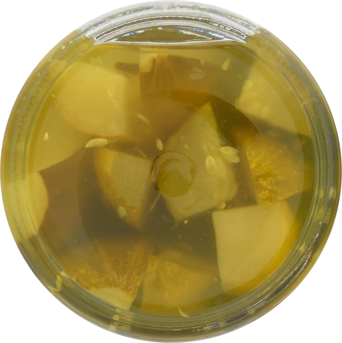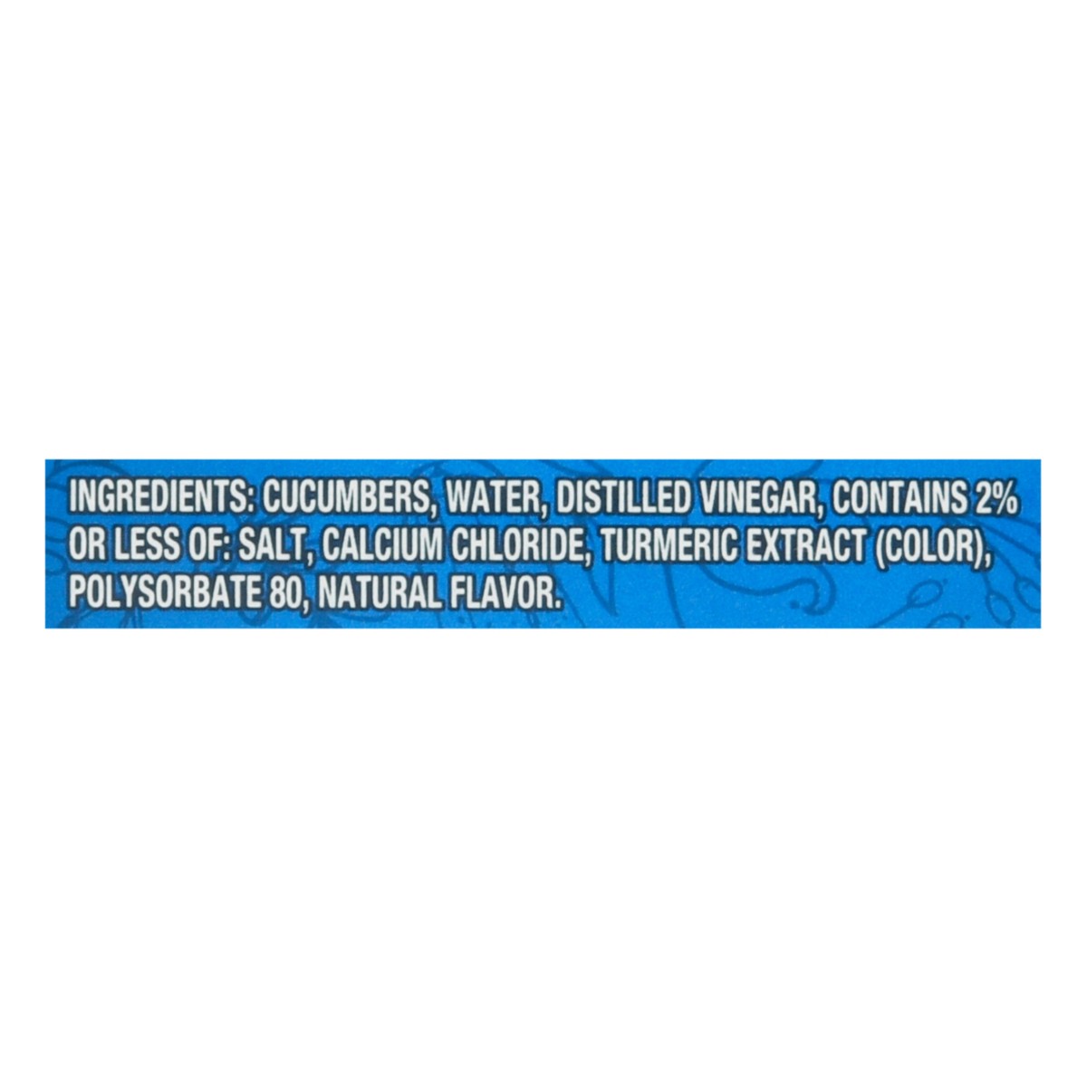 INGREDIENTS: CUCUMBERS, WATER, DISTILLED VINEGAR, CONTAINS 2% OR LESS OF: SALT, CALCIUM CHLORIDE, TURMERIC EXTRACT (COLOR), POLYSORBATE 80, NATURAL FLAVOR.