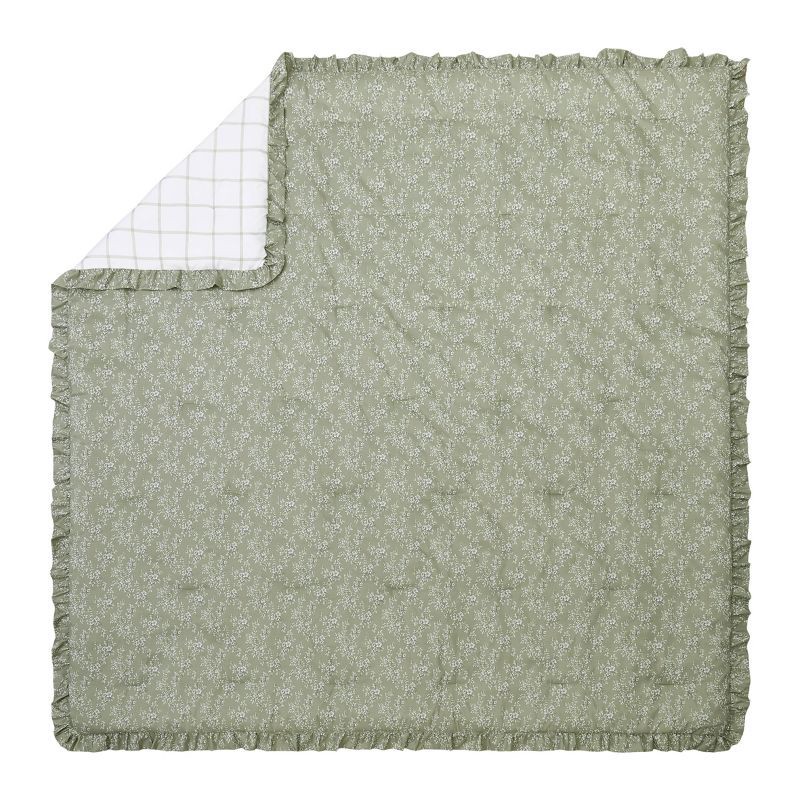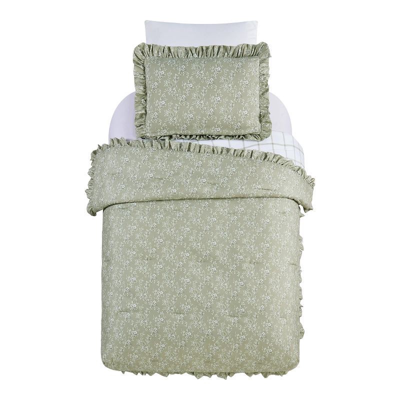 - Features a floral print in shades of green on the front, a matching green grid print on the back, and a beautiful ruffle on the edges of both the comforter and shams.