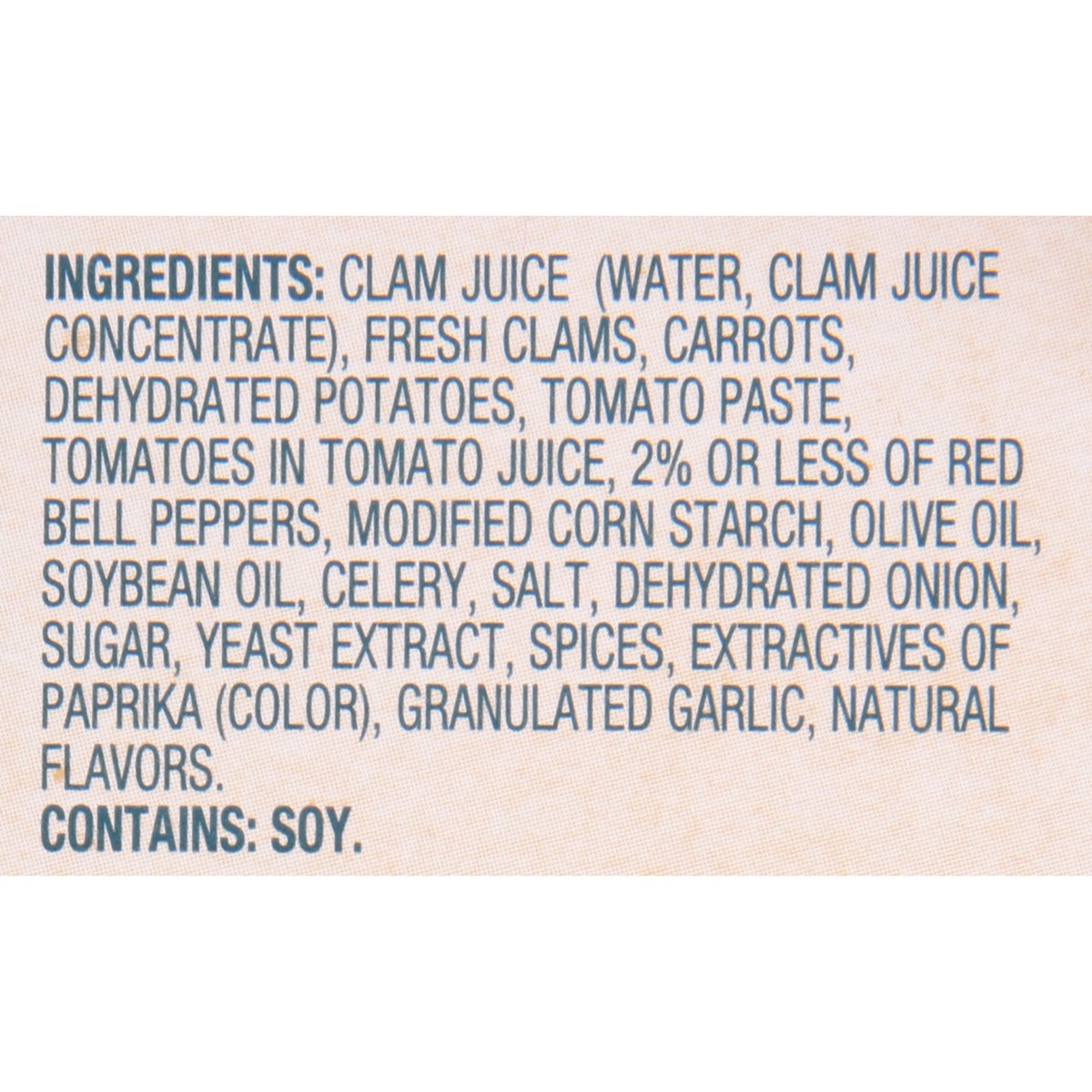 Clam Juice (Water, Clam Juice Concentrate), Fresh Clams, Carrots, Dehydrated Potatoes, Tomato Paste, Tomatoes in Tomato Juice, 2% or Less of Red Bell Peppers, Modified Corn Starch, Olive Oil, Soybean …