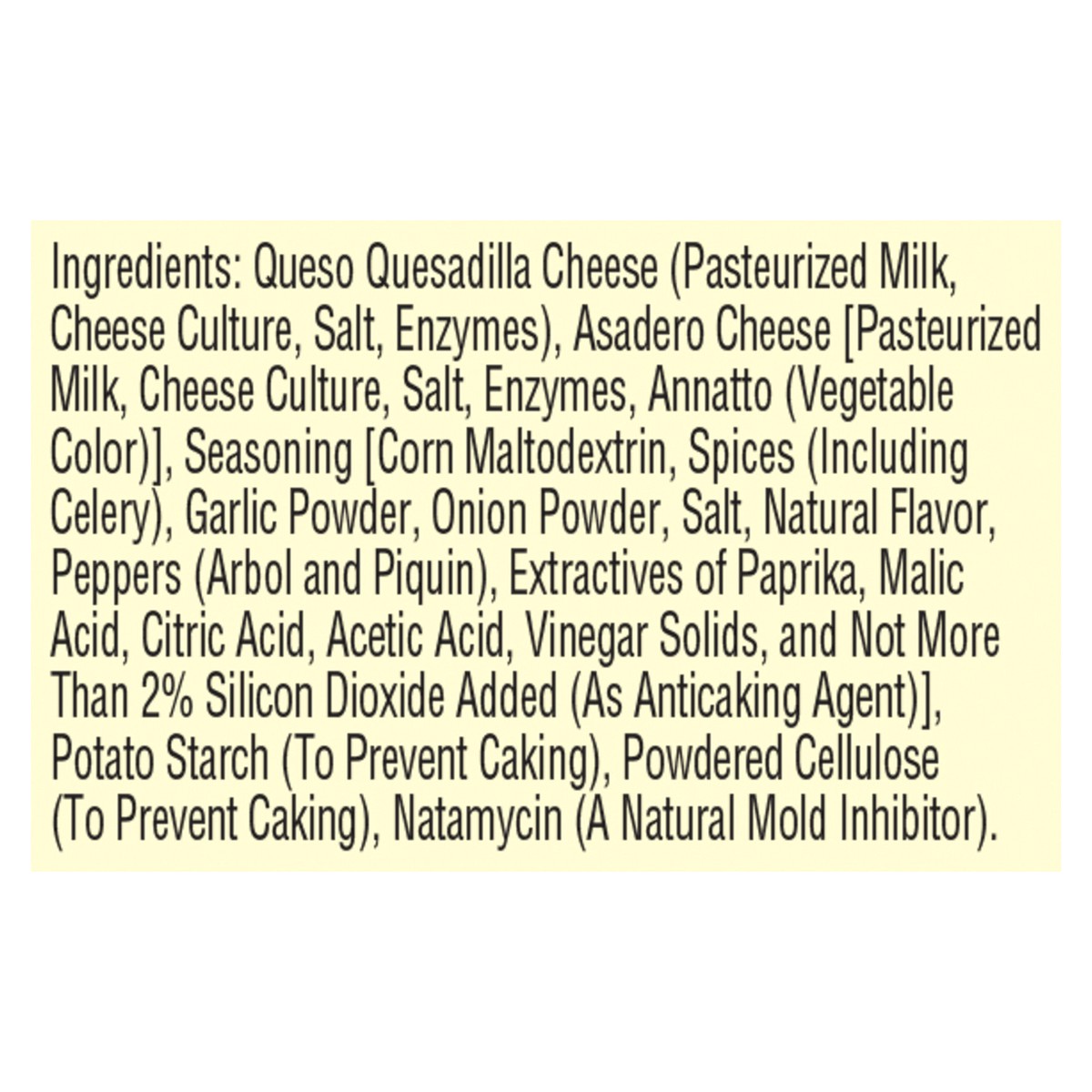 Queso Quesadilla Cheese (Pasteurized Milk, Cheese Culture, Salt, Enzymes), Asadero Cheese [Pasteurized Milk, Cheese Culture, Salt, Enzymes, Annatto (Vegetable Color)], Seasoning [Corn Maltodextrin, Sp…