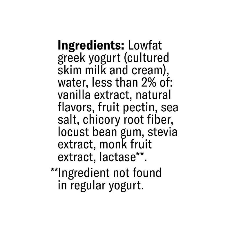 Lowfat Greek Yogurt (Cultured Skim Milk and Cream), Water, Less than 2% of: Vanilla Extract, Natural Flavors, Fruit Pectin, Sea Salt, Chicory Root Fiber, Locust Bean Gum, Stevia Extract, Monk Fruit Ex…