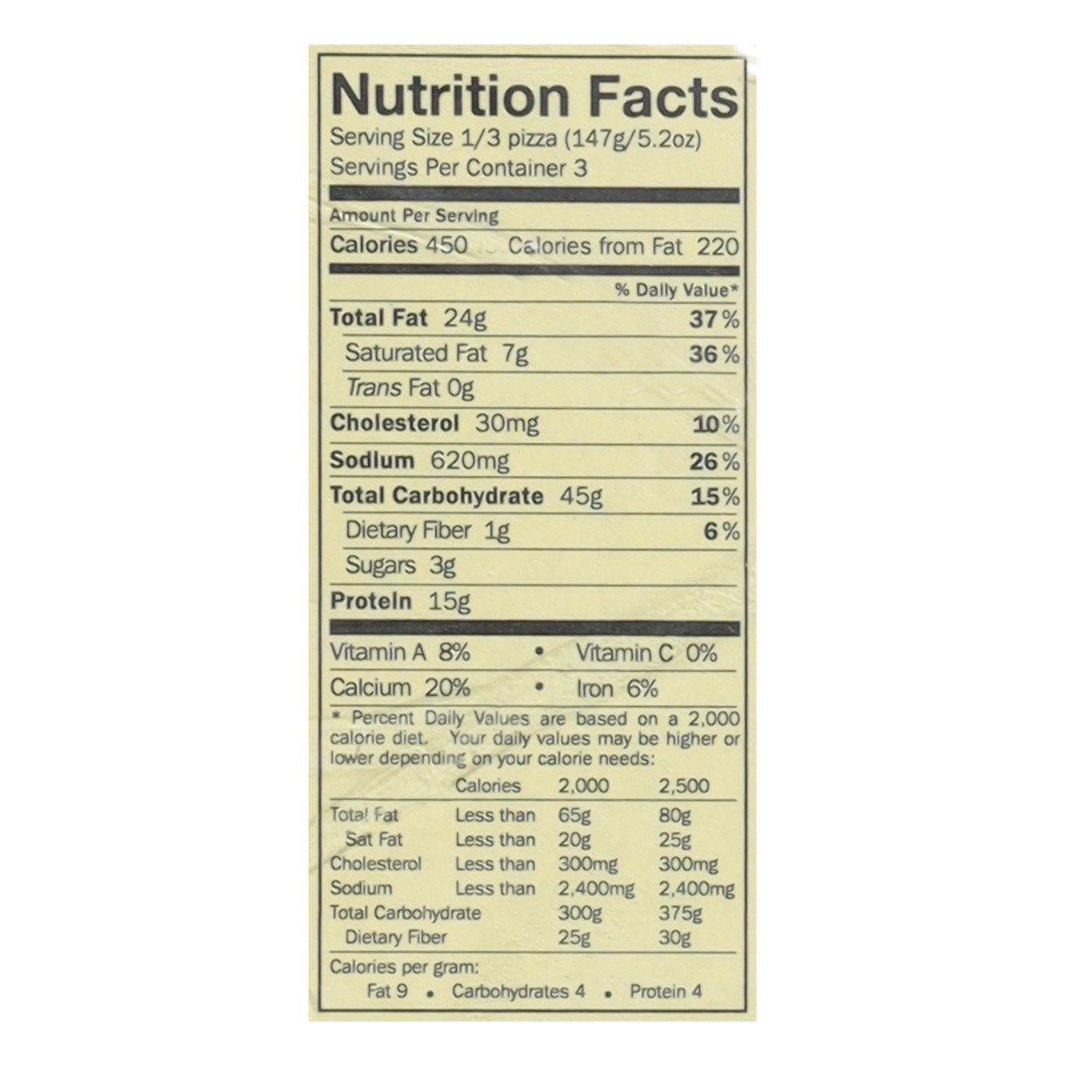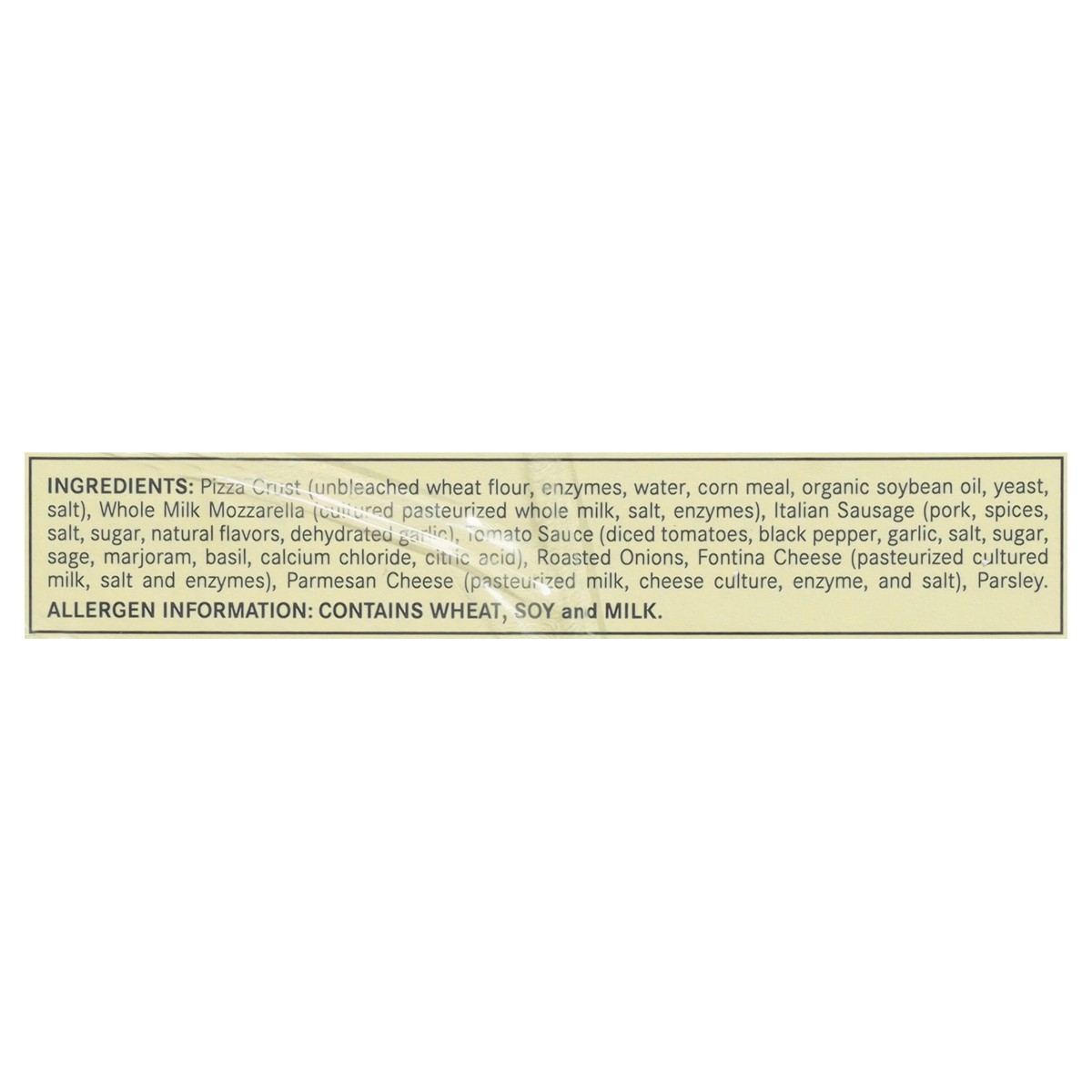 Pizza Crust (Unbleached Wheat Flour, Enzymes, Water, Corn Meal, Organic Soybean Oil, Yeast, Salt), Whole Milk Mozzarella (Red Pasteurized Whole Milk, Salt, Enzymes), Italian Sausage (Pork, Spices, Sal…