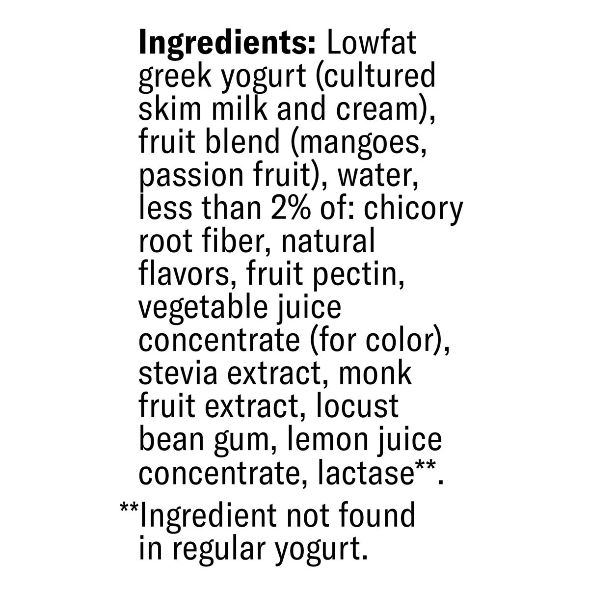Lowfat Greek Yogurt (Cultured Skim Milk and Cream), Mangoes, Water, Less than 2% of: Passion Fruit, Chicory Root Fiber, Natural Flavors, Fruit Pectin, Vegetable Juice Concentrate (for Color), Stevia E…