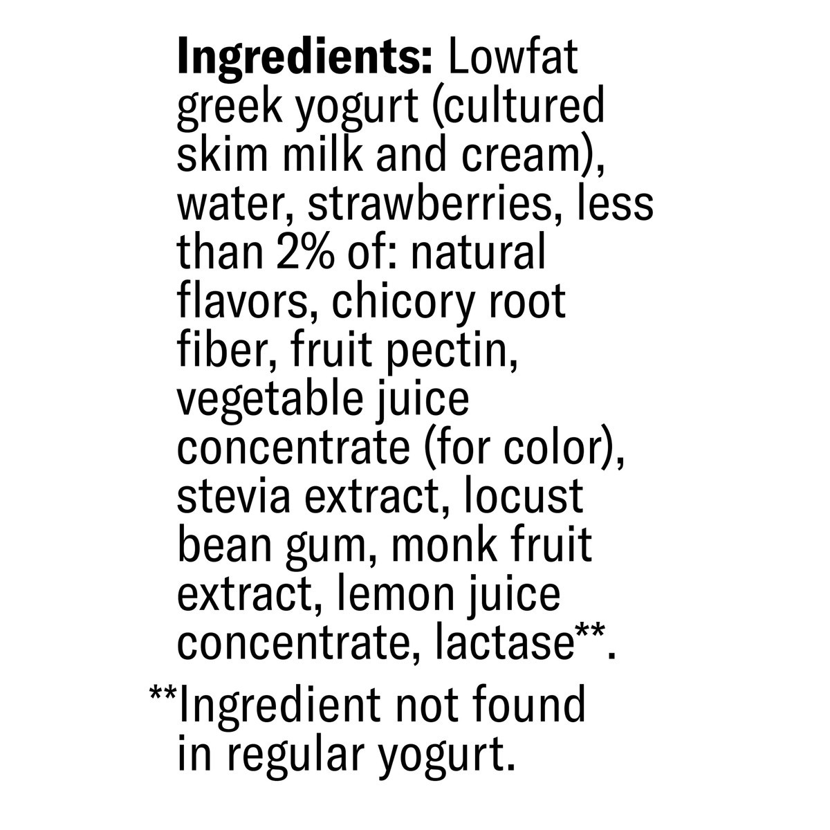 Lowfat Greek Yogurt (Cultured Skim Milk and Cream), Water, Strawberries, Less than 2% of: Natural Flavors, Chicory Root Fiber, Fruit Pectin, Vegetable Juice Concentrate (for Color), Stevia Extract, Lo…