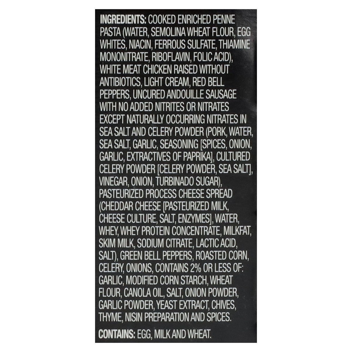 Cooked Enriched Penne Pasta (Water, Semolina Wheat Flour, Egg Whites, Niacin, Ferrous Sulfate, Thiamine Mononitrate, Riboflavin, Folic Acid), White Meat Chicken Raised Without Antibiotics, Light Cream…