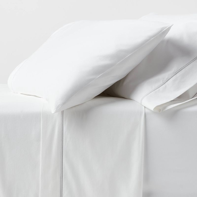 Bring home comfort and all-around dreaminess with this 4-Piece Hotel Collection Sheet Set from Threshold™. This pack includes a flat sheet, a fitted sheet, and two pillowcases made of double barratta …