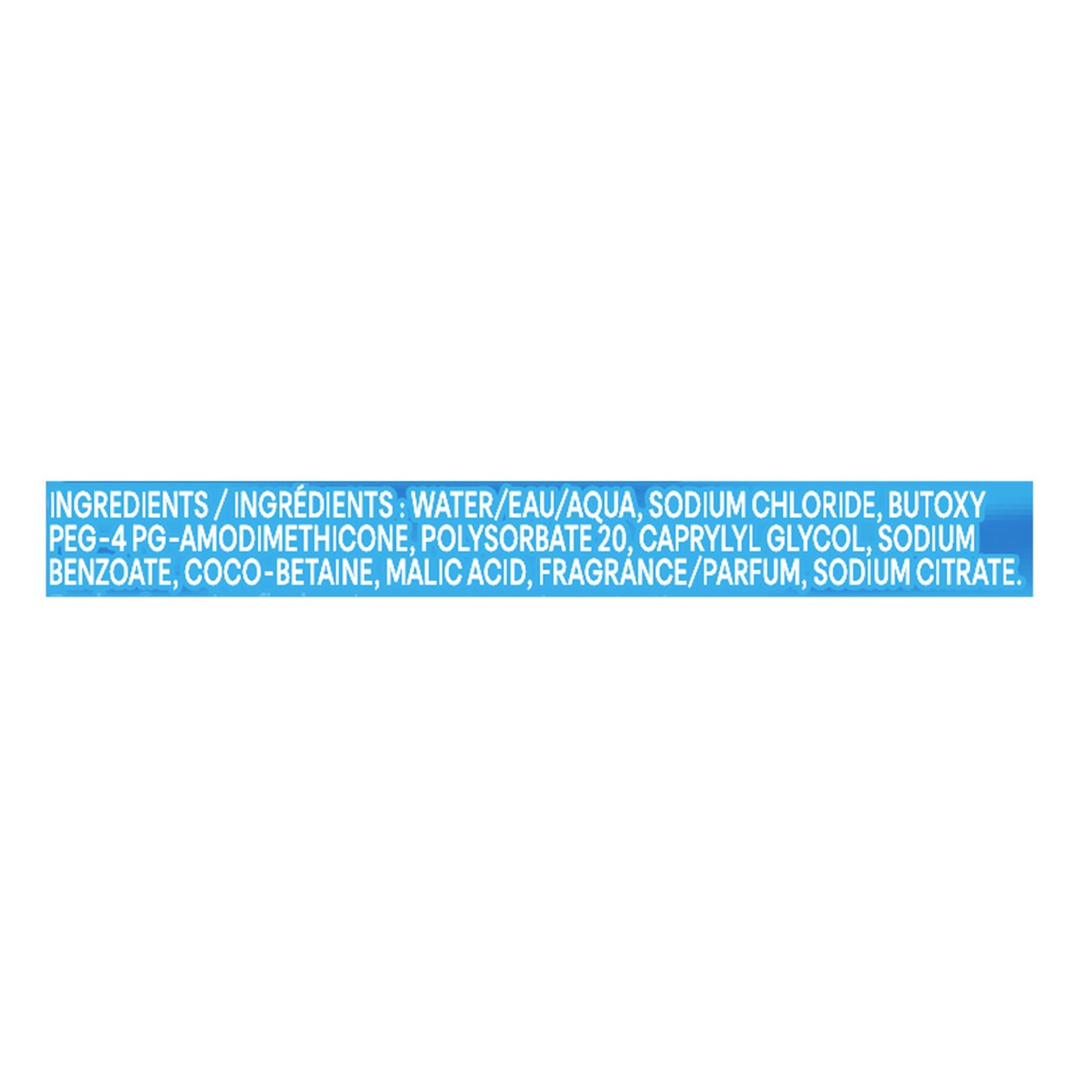 Water/Eau/Aqua, Sodium Chloride, Butoxy PEG-4 PG-Amodimethicone, Polysorbate 20, Caprylyl Glycol, Sodium Benzoate, Coco-Betaine, Malic Acid, Fragrance/Parfum, Sodium Citrate.