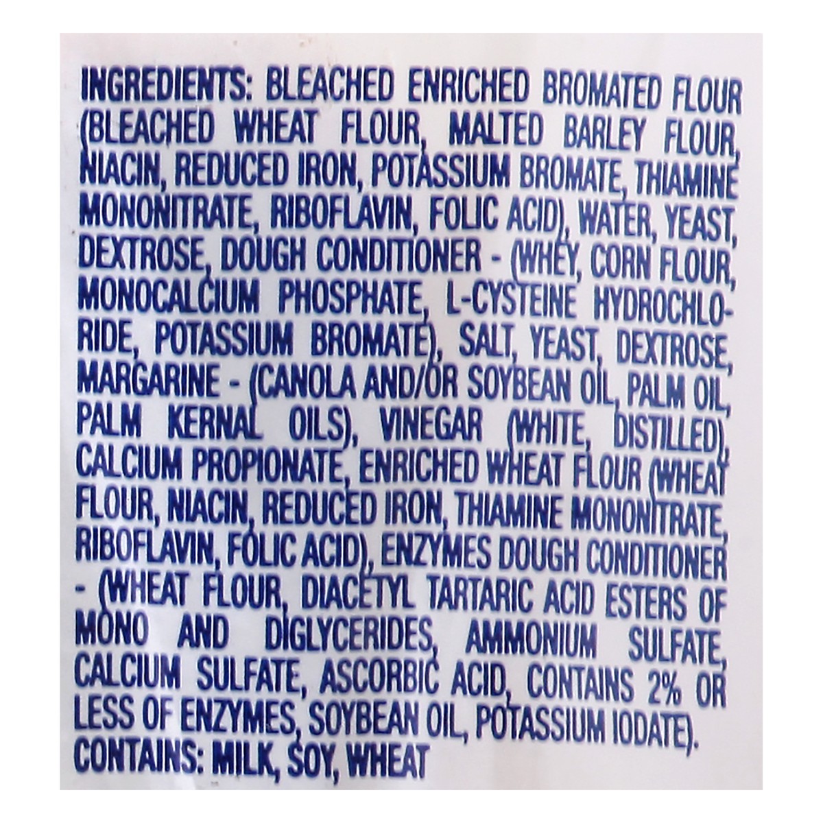 Bleached Enriched Bromated Flour (Bleached Wheat Flour, Malted Barley Flour, Niacin, Reduced Iron, Potassium Bromate, Thiamine Mononitrate, Riboflavin, Folic Acid), Water, Yeast, Dextrose, Dough Condi…
