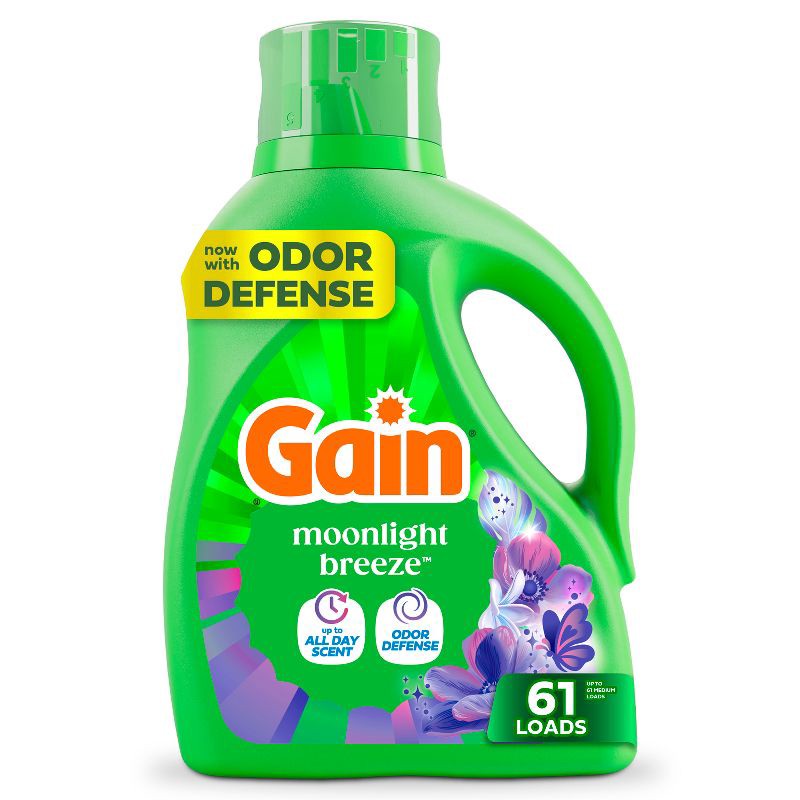 - PACKAGE CONTENTS: Includes one jug of 81 fl oz of Gain Liquid Laundry Detergent in Moonlight Breeze Scent, Now with Odor Defense, good for 61 Medium Loads
