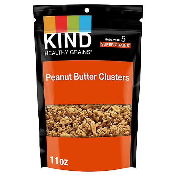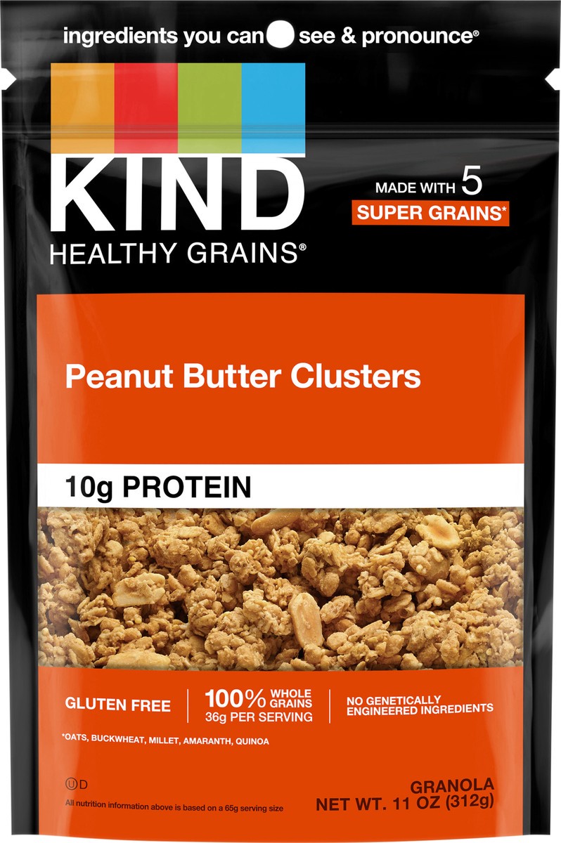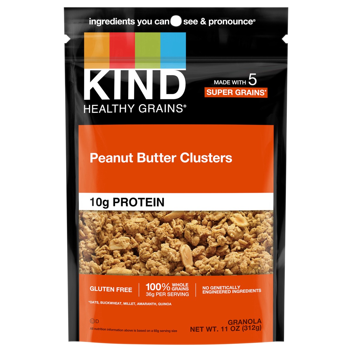 KIND HEALTHY GRAINS Peanut Butter Whole Grain granola clusters are an all-in-one, convenient, hand-to-mouth healthy snack mix. These wholesome clusters have 10 grams of protein and 34 grams of whole g…
