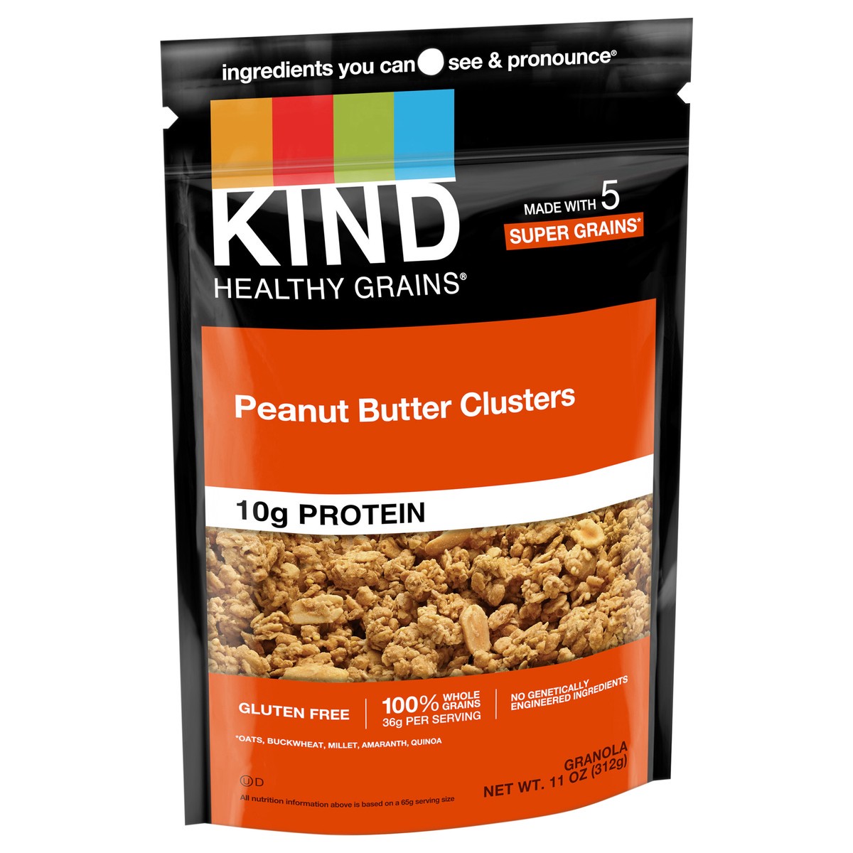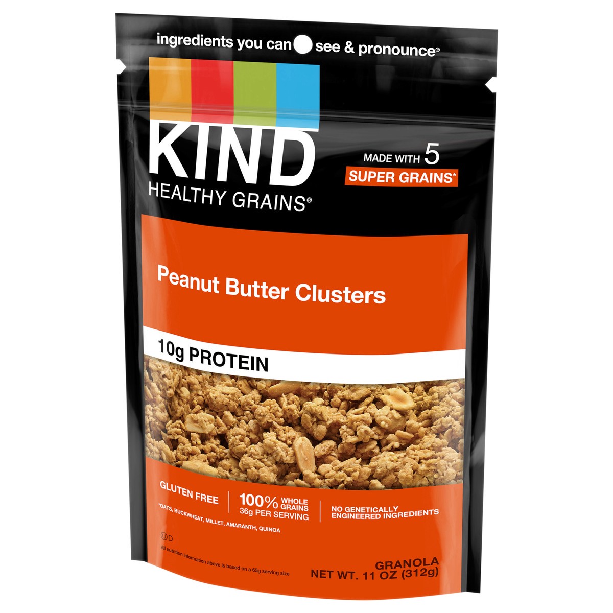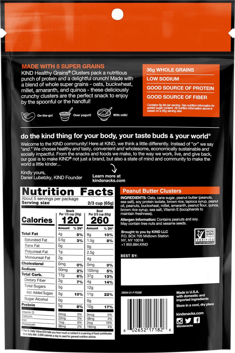 KIND HEALTHY GRAINS Peanut Butter Whole Grain granola clusters are an all-in-one, convenient, hand-to-mouth healthy snack mix. These wholesome clusters have 10 grams of protein and 34 grams of whole g…