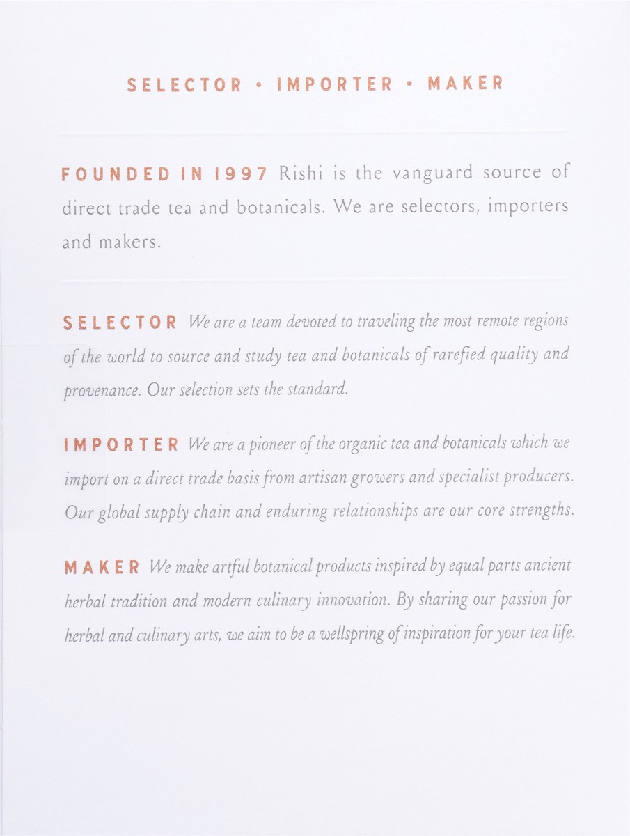 The perfect combination of spicy and sweet, this blend of hot ginger, sweet cassia cinnamon bark, orange peel and tulsi holy basil provides comforting warmth and intriguing aromatics.
