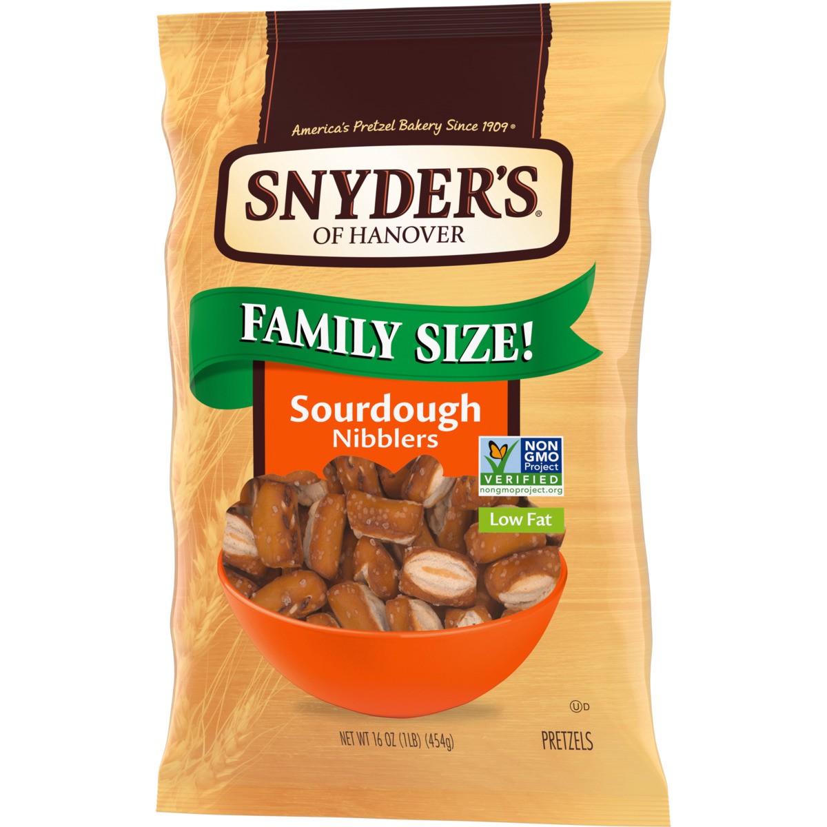 With Snyder's of Hanover Sourdough Pretzel Nibblers, you can enjoy the great taste of aged sourdough in a crunchy, bite-sized shape. Everyone can enjoy this Non-GMO Project Verified snack, which is ma…