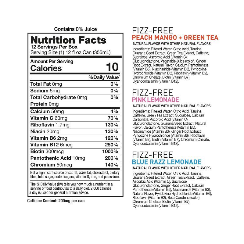Fizz-Free Peach Mango + Green Tea Natural Flavor With Other Natural Flavors Ingredients: Filtered Water, Citric Acid, Taurine, Guarana Seed Extract, Green Tea Extract, Caffeine, Sucralose, Ascorbic Ac…