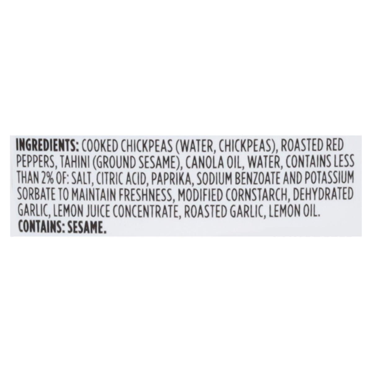 Cooked Chickpeas (Water, Chickpeas), Roasted Red Peppers, Tahini (Ground Sesame), Canola Oil, Water, Contains Less than 2% of: Salt, Citric Acid, Paprika, Sodium Benzoate and Potassium Sorbate to Main…