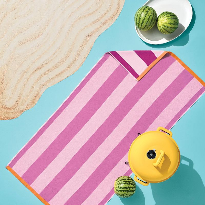 Bring timeless style to your beach days with this Vertical Cabana Striped Reversible Sand-Resist Beach Towel from Sun Squad™. Crafted from lightweight 100% cotton terry fabric, this sand-resist towel …