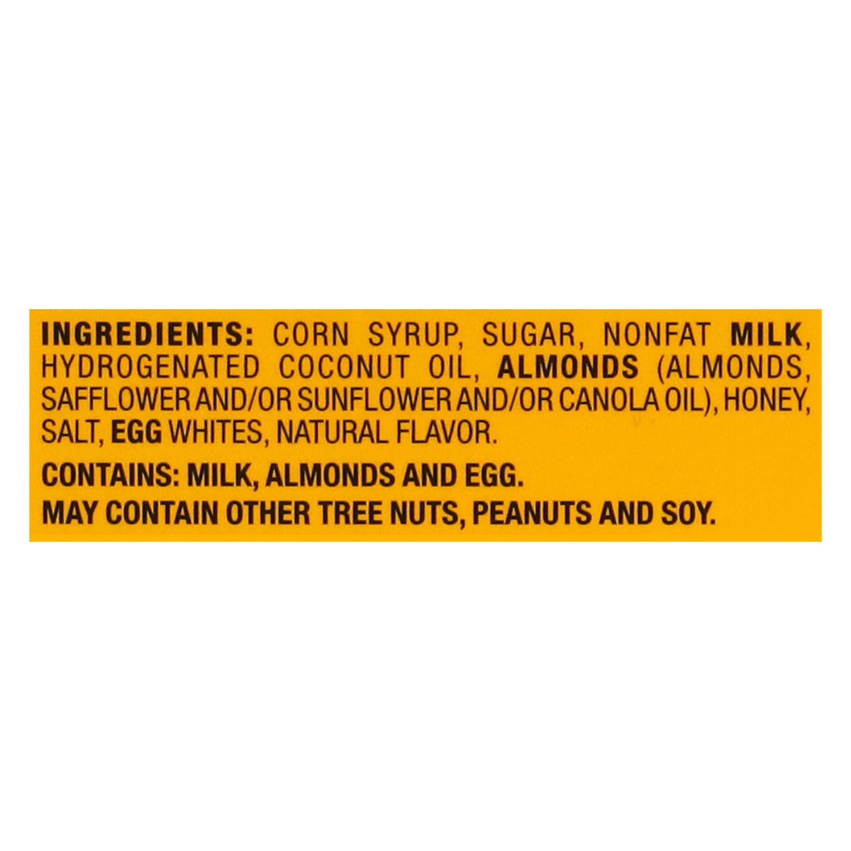 Corn Syrup, Sugar, Nonfat Milk, Hydrogenated Coconut Oil, Almonds (Almonds, Safflower and/or Sunflower and/or Canola Oil), Honey, Salt, Egg Whites, Natural Flavor.